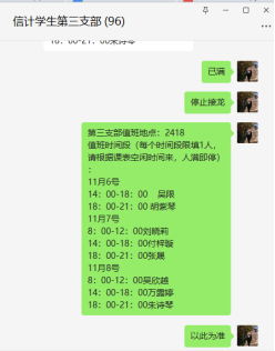 11月6日凌晨,信息与计算机工程学院党委书记、党委副书记、学工科长以及全体辅导员在学校集合。在做好学校统一安排要求后,学院结合实际情况,扎实做好学院的疫情防控工作。一是做好学生志愿者疫情防控相关培训工作,传递好新老志愿者手中的接力棒,实现无缝衔接。二是加强家校互动,利用微信群及时传达正确的疫情信息,解答家长们的疑虑,安抚家长的情绪。三是每天至少召开一次学工会,及时提出碰到的棘手问题,找到解决办法一事一办,绝不拖延,确保问题不过夜、标准不降低。五是要做好长期作战的心理准备,不允许有懈怠情绪;六是把控好舆论导向,做好引导工作,及时化解学生中的过激问题。