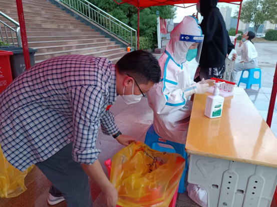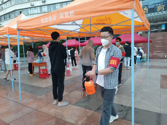 在每日一次的核酸检测中,张陆都早早来到现场协助志愿者们进行工作。在检测期间,全程在场监督,从学生定点集合,排队进行核酸检测登记,到督促学生们不扎堆、保持安全距离,现场消毒,及时的处理学生们的突发情况。他用实际行动保障了同学们检测工作的安全、有序、规范和高效。