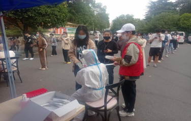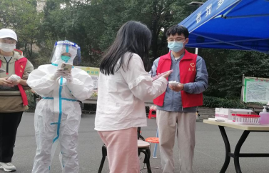 学校共有一食堂、英华楼、鼎新楼、体育馆四个核酸检测点。支委宋宇鑫老师带领支部成员分赴各个点开展志愿服务。“请佩戴好口罩,保持2米间隔”“请出示赣通码,并将手机亮度调至最高!”......有的志愿者成为了“秩序员”,响亮的声音从未停歇,一个个红色身影成为一道道靓丽的风景线;还有的学生志愿者穿上了密不透气的医务工作服,摇身变成了“大白”,引导、扫码、分发......全身心地参与核酸采样工作。他们任劳任怨、凝心聚力、连续奋战,坚守好每个核酸检测点,积极投入校园防疫一线。
