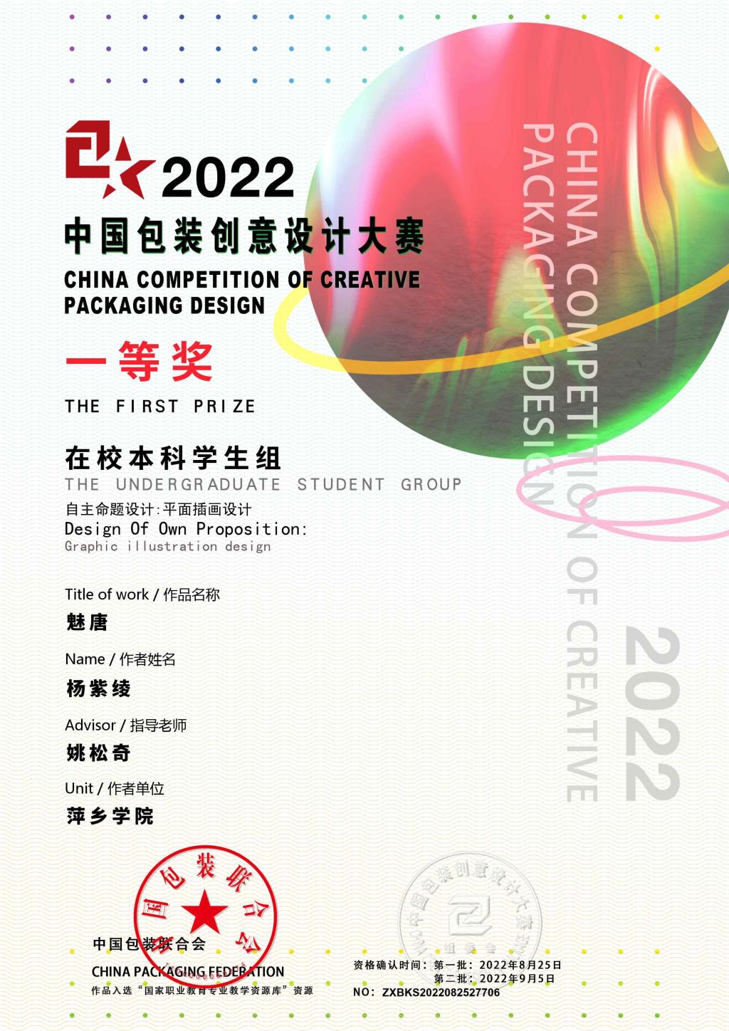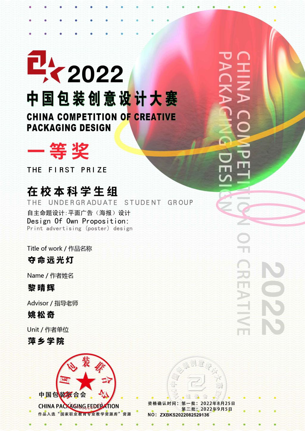 近日,2022年中国包装创意设计大赛结果公布,beat365官网艺术学院选送的作品共获得一等奖2项、二等奖2项、三等奖6项、优秀奖若干的好成绩。其中黎晴辉、杨紫绫同学荣获学生组一等奖;邓宇洁、张文达同学荣获学生组二等奖;陈宇婷、黎晴辉、林春燕、向雯婷同学荣获学生组三等奖;胡志才、姚松奇老师荣获专业组三等奖。
