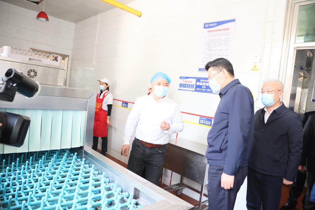 刘烁一行走进学校食堂,实地察看了食堂的消毒设备、食品留样柜、员工操作间,详细了解了食堂工作规章制度、员工的健康情况等,认真听取了学校负责人关于食品安全工作的介绍,并就食堂安全管理体系、常态化防控、应急处置、宣传培训等方面的情况与食堂负责人进行了交谈。