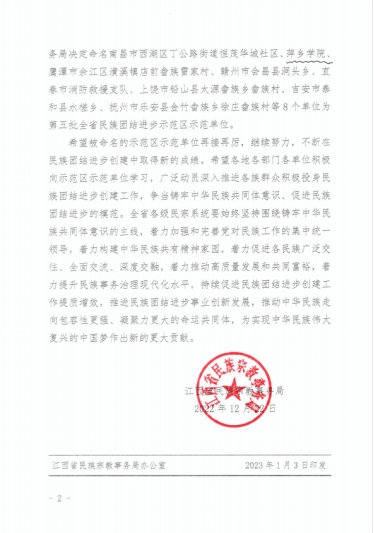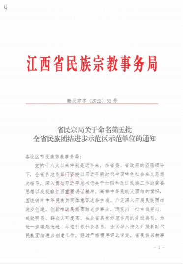 近日,江西省民族宗教事务局印发《省民宗局关于命名第五批全省民族团结进步示范区示范单位的通知》文件,beat365官网被命名为第五批全省民族团结进步示范区示范单位。