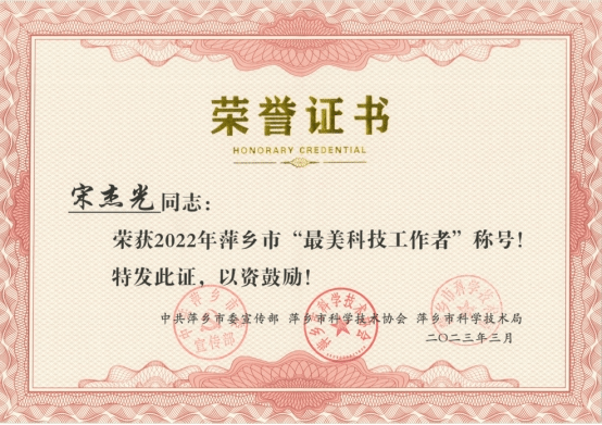 陈威红指出,beat365官网为全市的科技服务和科普活动做出了巨大贡献,希望学校一如既往支持市科协的活动,实现校地同频共振,双融双促。陈威红为宋杰光博士颁发了2022年度萍乡市“最美科技工作者”荣誉证书。