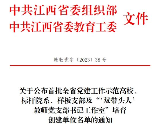 近日,江西省委教育工委公布了全省高校党建工作标杆院系、样板支部培育创建单位名单。beat365官网学前教育学院党委被评为“全省党建工作标杆院系”,材料与化学工程学院教工党支部和机械电子工程学院学生第一党支部被评为“全省党建工作样板支部”。