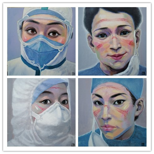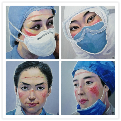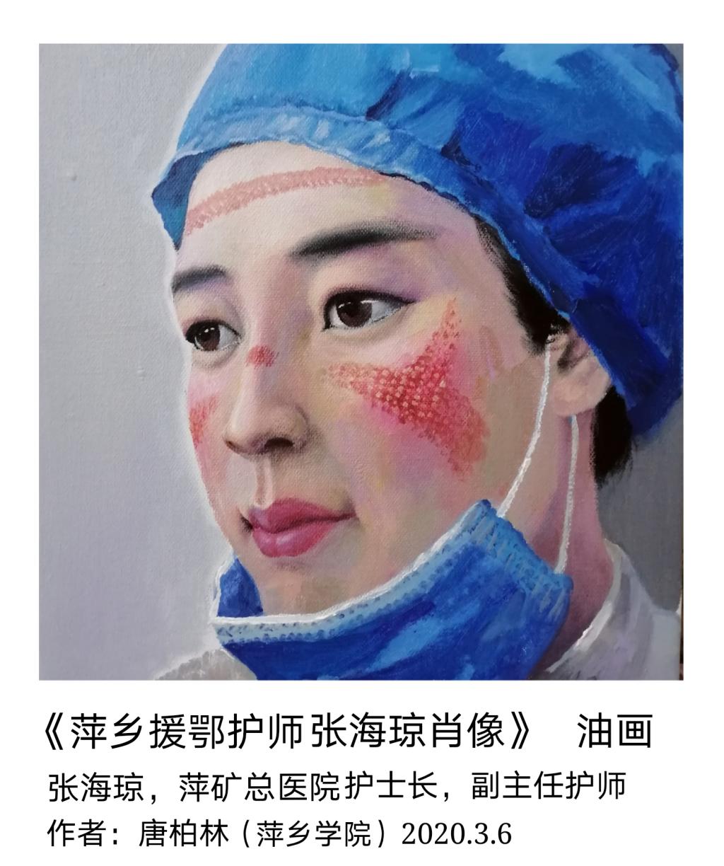 新冠肺炎疫情发生后,全国各地的医护人员奔赴前线,为打赢这场抗击疫情的阻击战而逆风战斗。正是在这样的现实背景下,唐柏林有感于医护工作人员的勇敢担当、无私奉献的大无畏情怀,拿起手中的画笔,创作了12幅“天使的面容”系列油画作品。这些绘画作品以特写的方式呈现,描绘了奋战在抗疫一线的医护工作人员。在系列油画作品中,其中有一幅,最令唐柏林印象深刻。油画的主人公是萍矿总医院呼吸科护士长、副主任护师张海琼,抗击新冠肺炎战斗打响后,她毅然加入江西援鄂医疗队奔赴前线,到达湖北随州,与同事们并肩战斗。当了解到护士长的事迹,看到脸上因长期戴口罩和护目镜而留下的印痕后,唐柏林被深深的打动,决定要用画笔记录下来,以表达对前线医护人员的敬意。