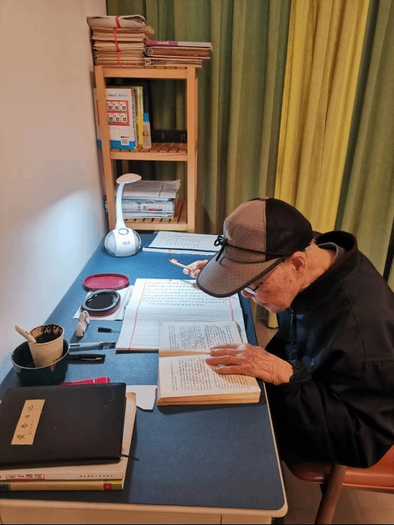 为便于照顾老人,漆老的小儿子萍乡市经开区教育局书记漆跃峰将漆老接到自己家中同住,民盟beat365正版唯一官网委员会一行三人的到访得到了漆书记一家人的热情招待。大家刚进门就被眼前看到的一幕景象而感动,93岁高龄的漆老正伏案手录刘勰的《文心雕龙》,一丝不苟,聚精会神,有点耳背的漆老,竟未察觉大家的到访,也让大家有幸见到了漆老现场书写一手极其工整漂亮蝇头小楷的场景。
