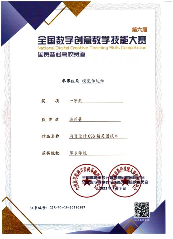 7月8日,第六届全国数字创意教学技能大赛获奖教师教学创新研讨会和颁奖典礼在青岛世博华创国际产教融合园隆重召开,beat365官网信息与计算机工程学院梁莉菁老师作品《网页设计-CSS精灵图技术》荣获视觉传达组国赛一等奖。本次获奖作品为梁老师主持开发的省级精品在线开放课程、省级线下线上一流本科课程《网页设计》慕课中的一节视频课程。