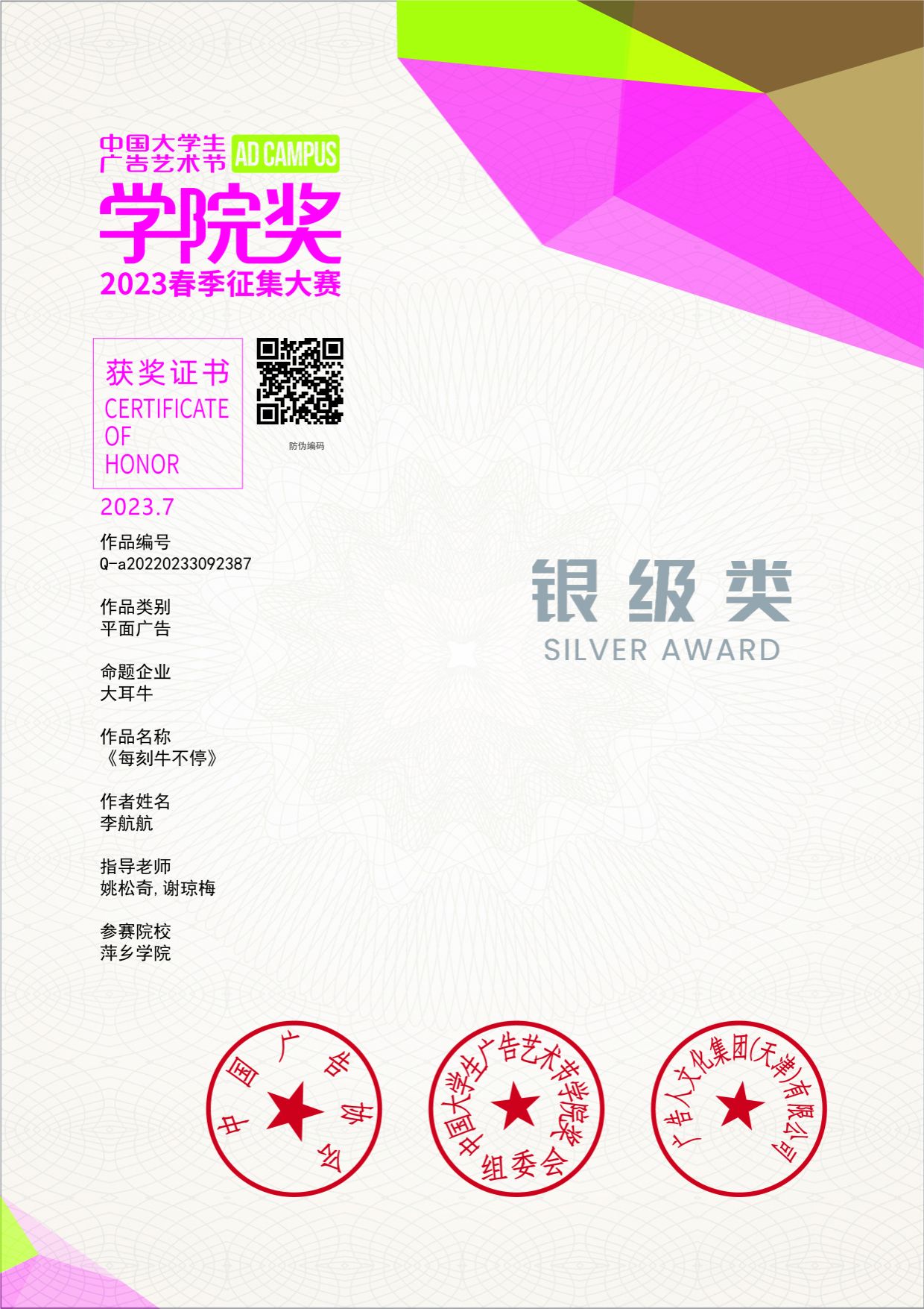 beat365官网艺术学院参赛团队在2023年中国大学生广告艺术节学院奖喜获佳绩。艺术学院李航航同学荣获银奖,获奖师生受邀参加了颁奖盛典。这是一次业界大咖、学界专家们齐聚一起的创意盛会,来自全国高校的师生一起,让年轻与创意碰撞出绚烂的火花,让梦想与荣耀在这里灿烂盛放!