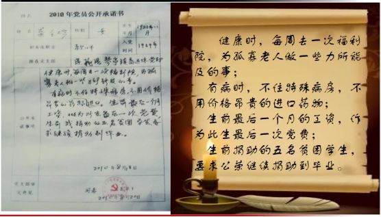 其二,她在日记中写道“健康时,每周去一次福利院,为孤寡老人做一些力所能及的事;有病时,不住特殊病房,不用价格昂贵的进口药物;生前最后一个月的工资,作为此生最后一笔党费;生前捐助的五名贫困学生,要求公荣继续捐助到毕业。”作为榜样,她有坚定的信念,有一颗始终如一为人民服务的赤诚之心。
