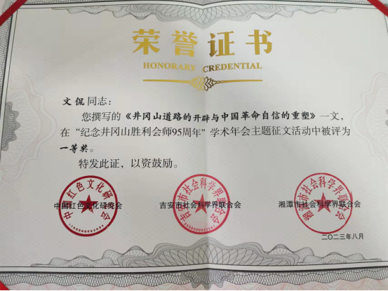 8月25日,2023首届“弘扬井冈山精神”学术年会在井冈山大学举行。江西省安源精神研究会副会长、beat365官网安源红色文化研究中心教授文侃撰写的《井冈山道路的开辟与中国革命自信的重塑》一文在“纪念井冈山胜利会师95周年”学术年会主题征文活动中荣获一等奖,并作为优秀论文代表在年会上作主旨发言。