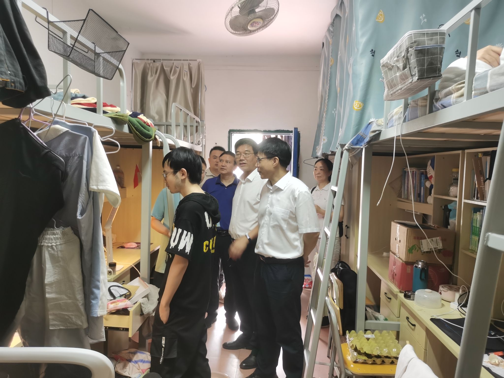 9月29日,校党委书记邱晓辉,校长刘林芽,校党委委员、副校长陈永国带领党政办、学工处、后勤处、科发公司等相关部门深入学生宿舍、食堂,对中秋国庆双节期校园安全工作进行检查,并对重点区域安全工作进行现场巡看。