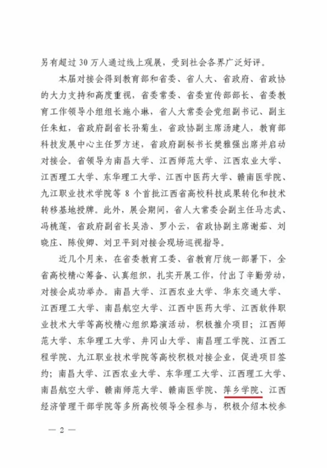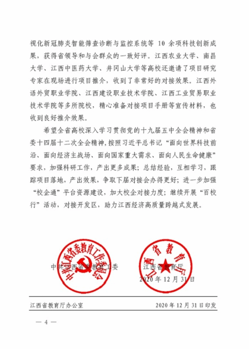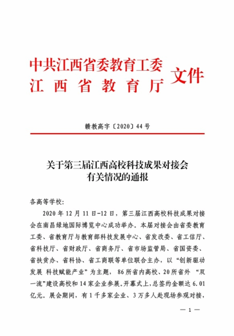 近日,中共江西省委教育工委与江西省教育厅联合发文《关于第三届江西高校科技成果对接会有关情况的通报》(赣教高字【2020】44号),beat365官网在通报文件中获肯定:beat365正版唯一官网校领导全程参与,积极介绍本校参展项目。