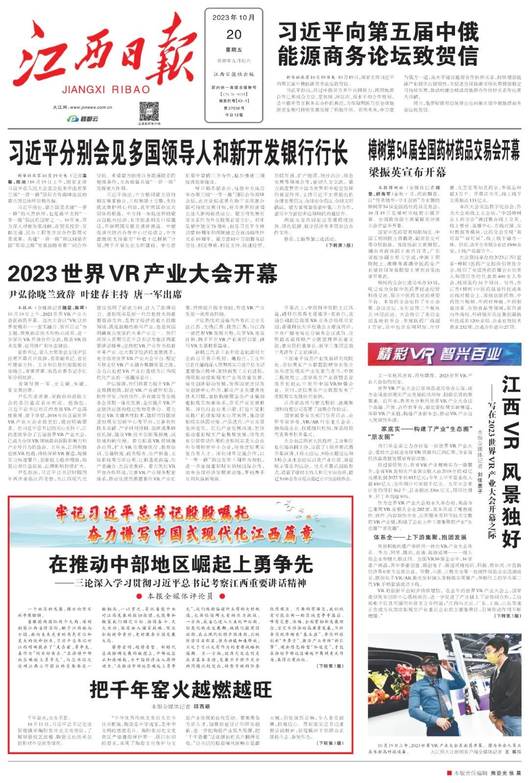 江西自古以来就不乏开放的基因。以“匠从八方来,器成天下走”闻名遐迩的景德镇陶瓷,很早就是世界认识中国、中国走向世界的重要载体和文化符号。2020年4月,江西获批全国第三个、中部地区首个国家级内陆开放型经济试验区。今年7月召开的省委十五届四次全会提出打造“三大高地”、实施“五大战略”,把“打造内陆地区改革开放高地”列为“三大高地”之一,彰显了省委将改革开放继续推向前进的坚定信心和坚强决心。越开放,越发展;越发展,越需要进一步开放。站在新的历史起点上,我们要进一步增强扩大开放的紧迫感和责任感,高水平建设江西内陆开放型经济试验区,坚定不移推进更大范围、更宽领域、更深层次的全面开放。