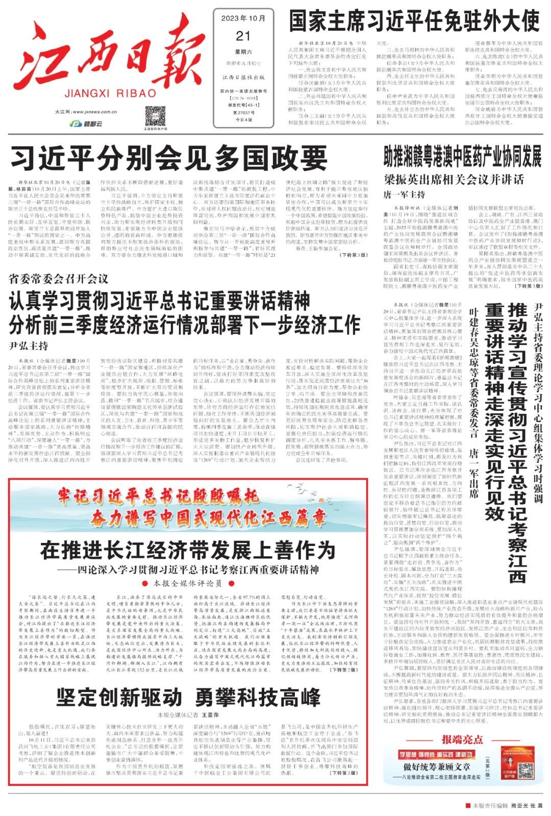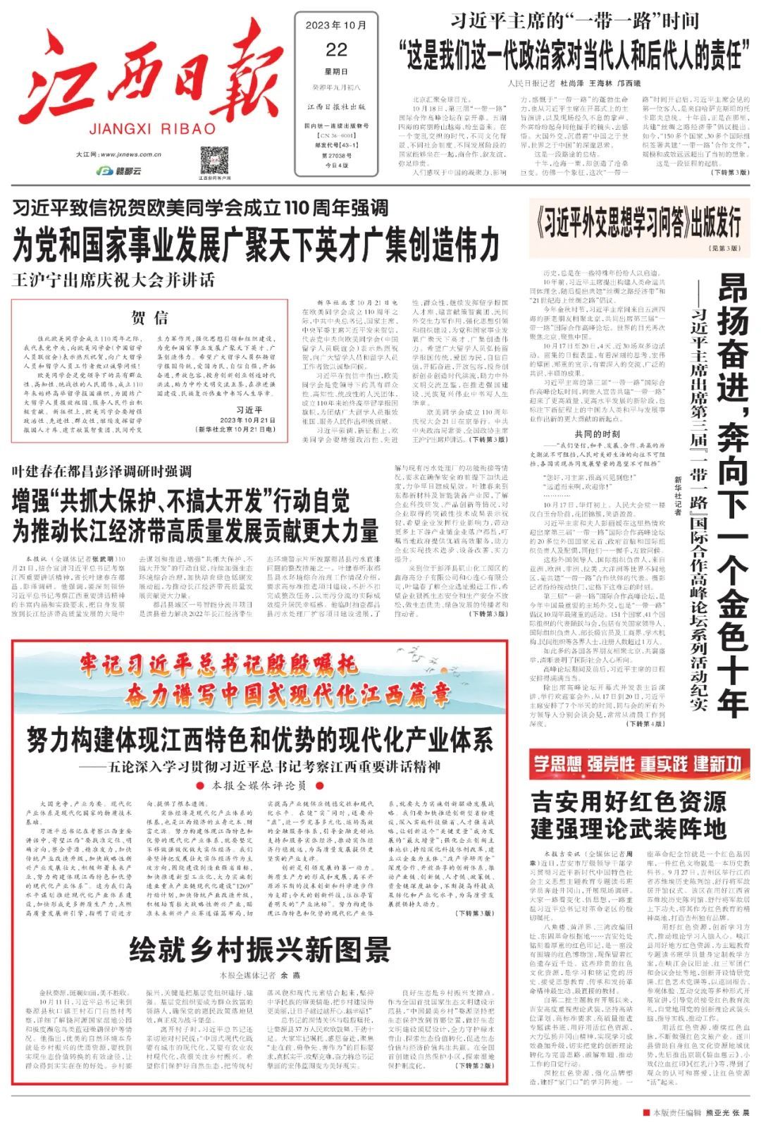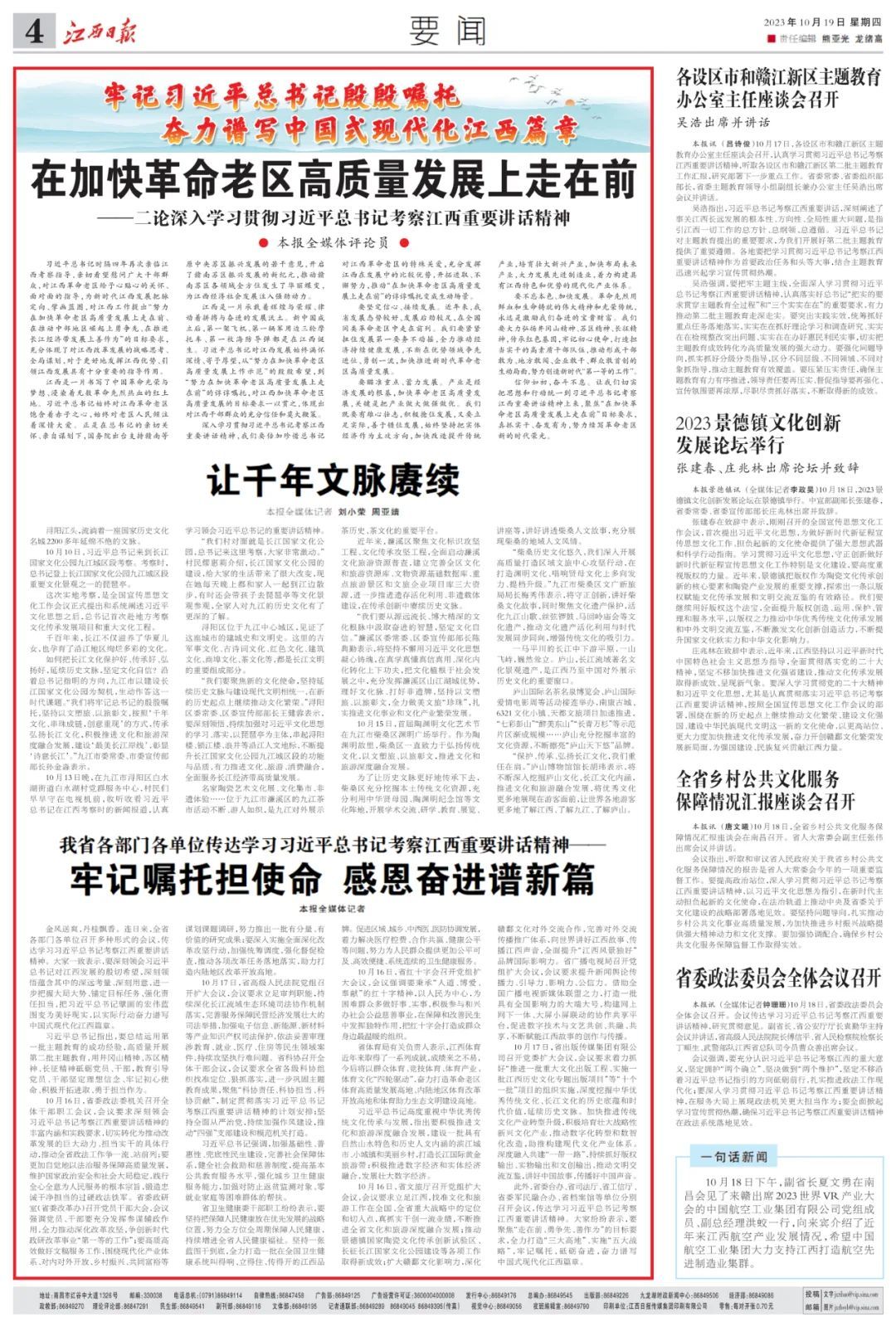习近平总书记时隔四年再次亲临江西考察指导,亲切看望慰问广大干部群众,对江西革命老区给予心贴心的关怀、面对面的指导,为新时代江西发展把脉定向、擘画蓝图,对江西工作提出“努力在加快革命老区高质量发展上走在前、在推动中部地区崛起上勇争先、在推进长江经济带发展上善作为”的目标要求,充分体现了对江西改革发展的战略思考、全局谋划,对于更好地发挥江西优势、引领江西发展具有十分重要的指导作用。