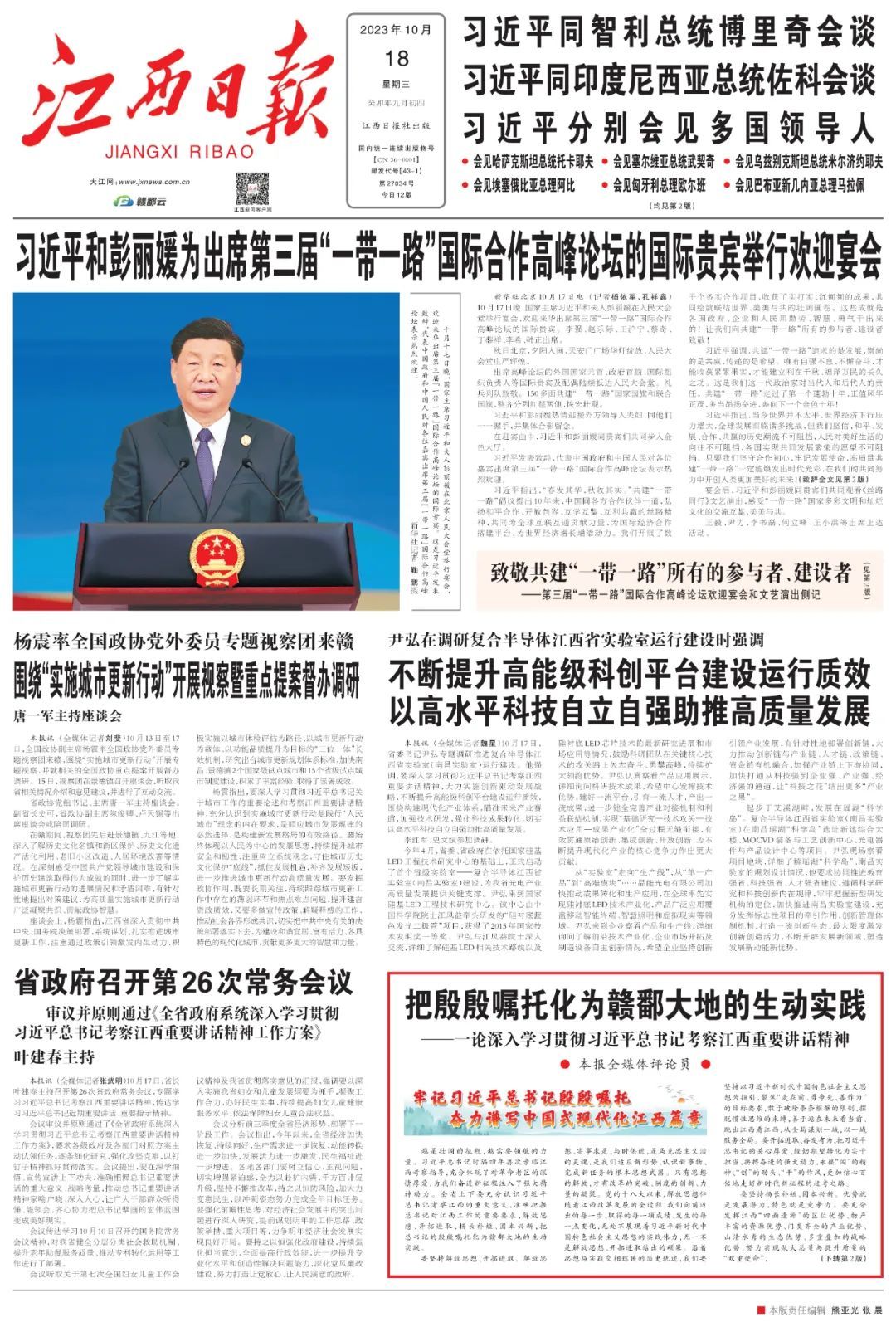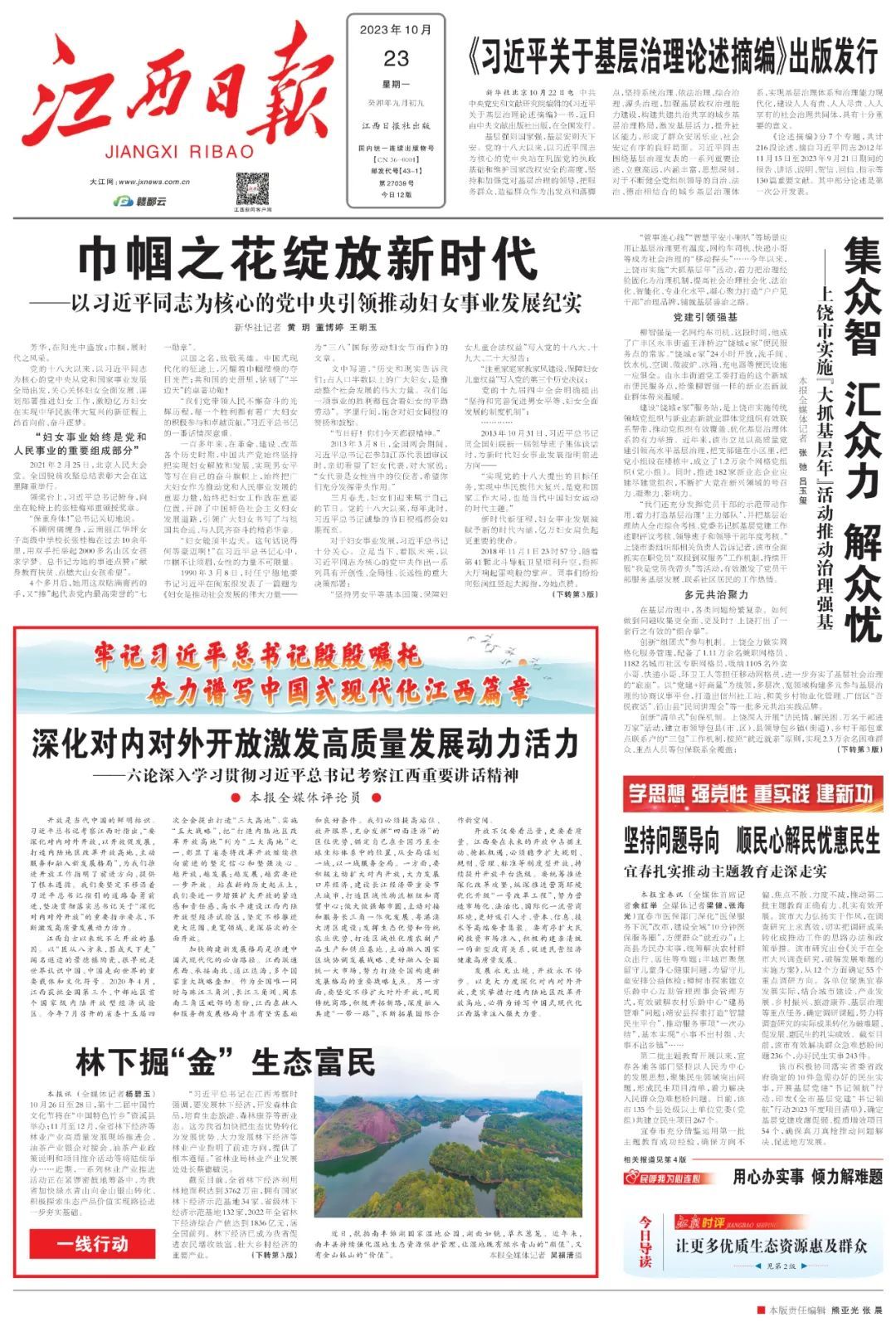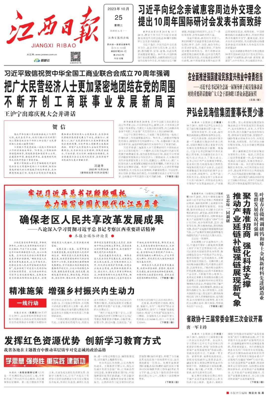 习近平总书记时隔四年再次亲临江西考察指导,亲切看望慰问广大干部群众,对江西革命老区给予心贴心的关怀、面对面的指导,为新时代江西发展把脉定向、擘画蓝图,对江西工作提出“努力在加快革命老区高质量发展上走在前、在推动中部地区崛起上勇争先、在推进长江经济带发展上善作为”的目标要求,充分体现了对江西改革发展的战略思考、全局谋划,对于更好地发挥江西优势、引领江西发展具有十分重要的指导作用。