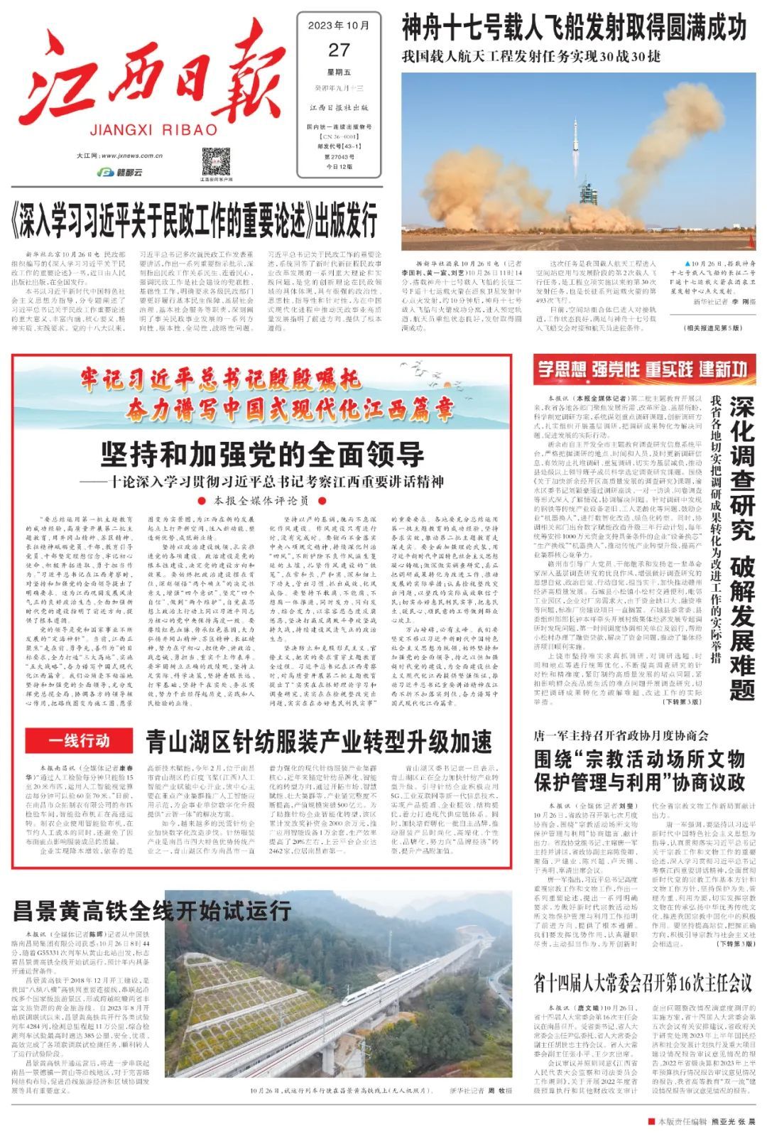 党的领导是党和国家事业不断发展的“定海神针”。当前,江西正聚焦“走在前、勇争先、善作为”的目标要求,全力打造“三大高地”、实施“五大战略”,奋力谱写中国式现代化江西篇章。我们必须毫不动摇地坚持和加强党的全面领导,充分发挥党总揽全局、协调各方的领导核心作用,把路线图变为施工图、愿景图变为实景图,为江西在新的发展起点上打开新空间、注入新动能、塑造新优势、成就新业绩。