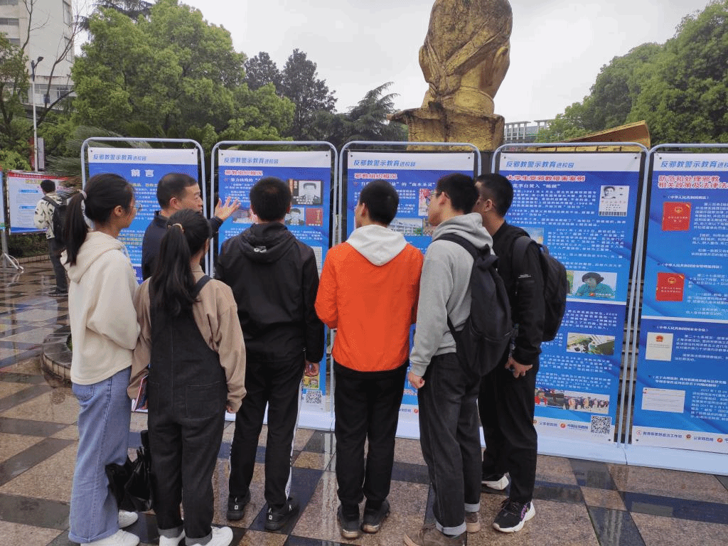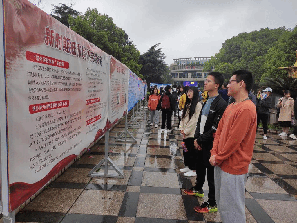 4月15日上午,校党委统战部联合保卫处在文廷式中心广场开展了民族宗教政策法规宣传教育活动。此次展览是以图文并茂的形式,从反邪教政策法规、大学生受邪教侵害案例、防范和处理邪教相关政策及法律法规、邪教组织概况等四个方面生动的进行了展示,吸引了广大学生的广泛关注和积极参与,取得了良好的宣传效果。