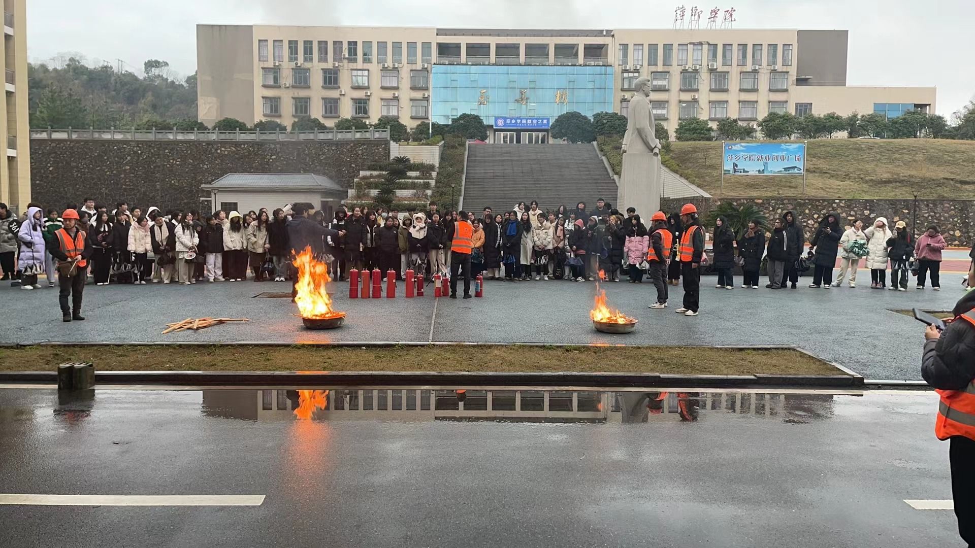 逃生演练结束后,学校在天泉楼广场还组织了一场消防灭火器的使用与实际操作,传授了如何使用灭火器的技巧以及着火时灭火的基本常识,每一位学生都亲自体验了灭火器的使用方法,做到了人人会使用灭火器。