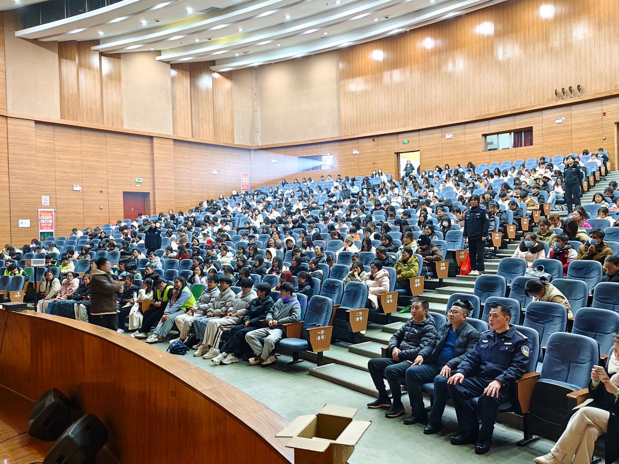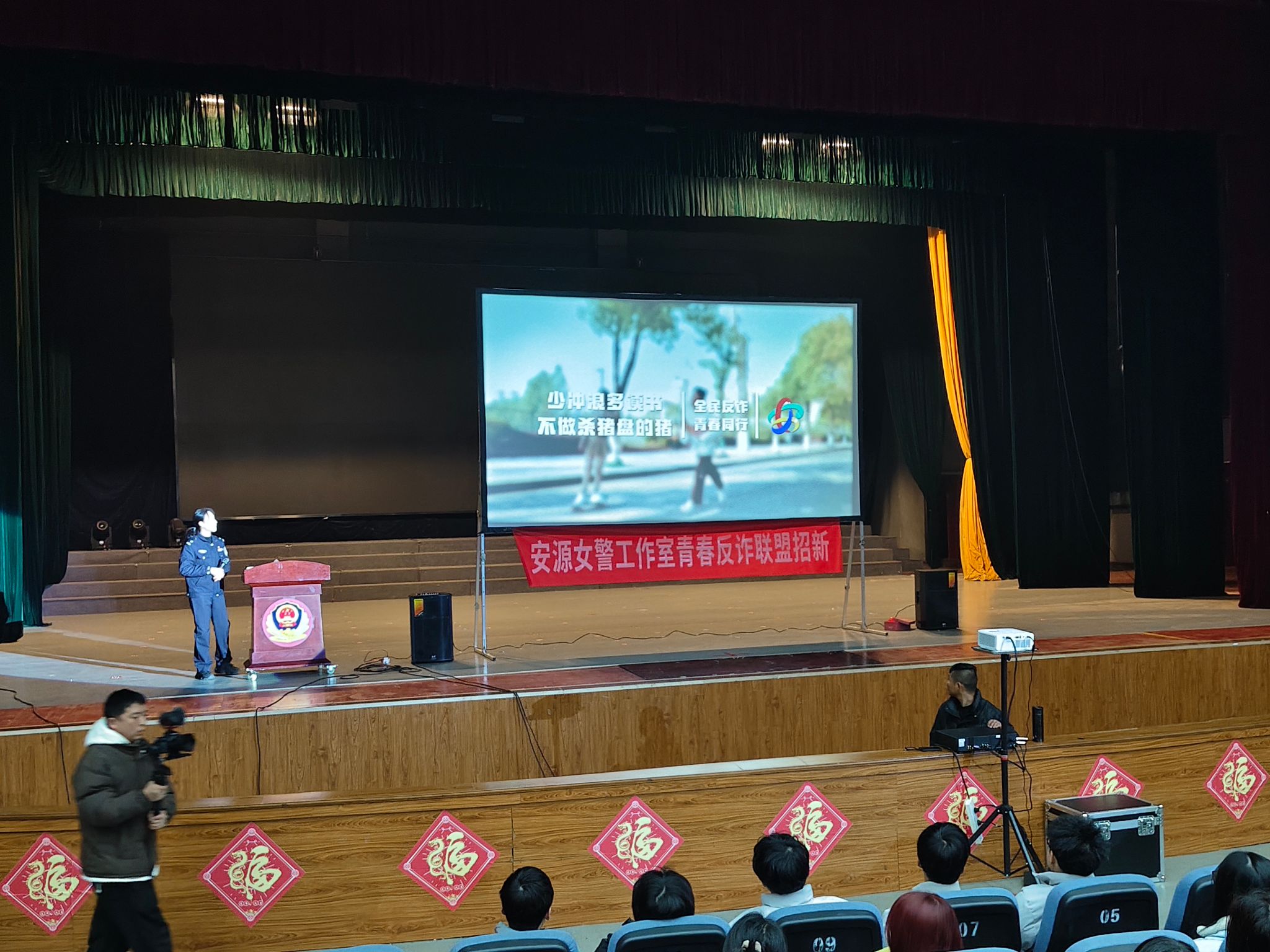 在电影放映前,女警工作室干警通过宣讲、互动的形式,结合电信网络诈骗真实案例,用通俗易懂的语言向学生生们讲清电信网络诈骗的主要手段及防范措施。