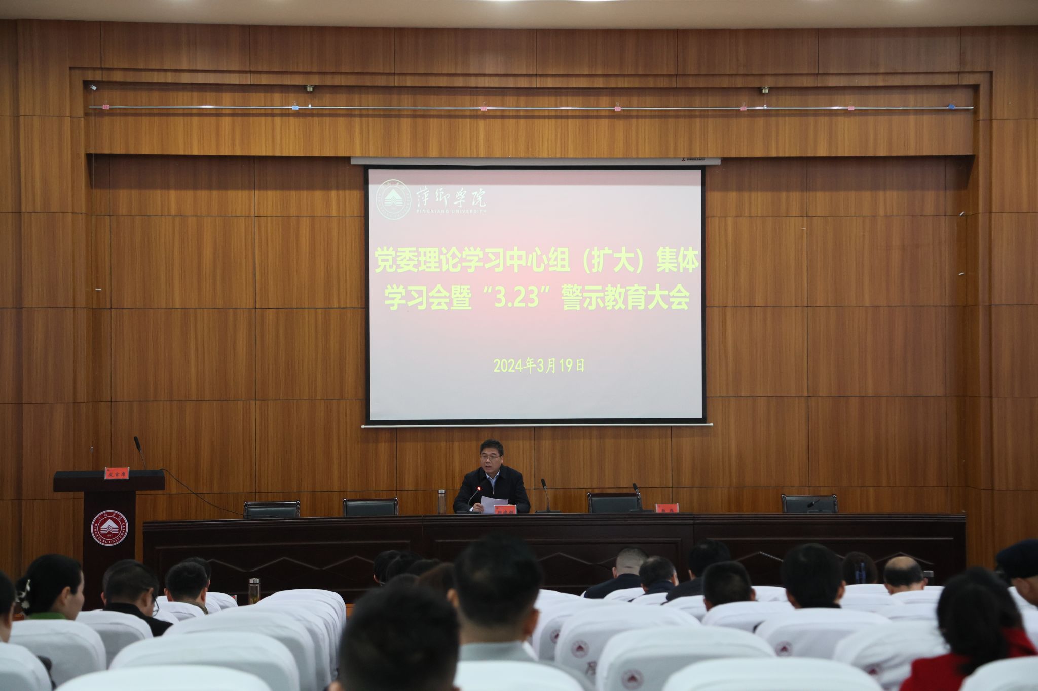 319日,beat365官网在至善楼学术报告厅召开党委理论学习中心组(扩大)集体学习会暨“3.23”警示教育大会,深入学习贯彻习近平总书记关于全面从严治党的重要论述,认真学习贯彻新修订的《中国共产党纪律处分条例》。全体在家校领导出席学习会。全校副处级以上领导干部参加学习会。学习会由校党委书记邱晓辉主持。
