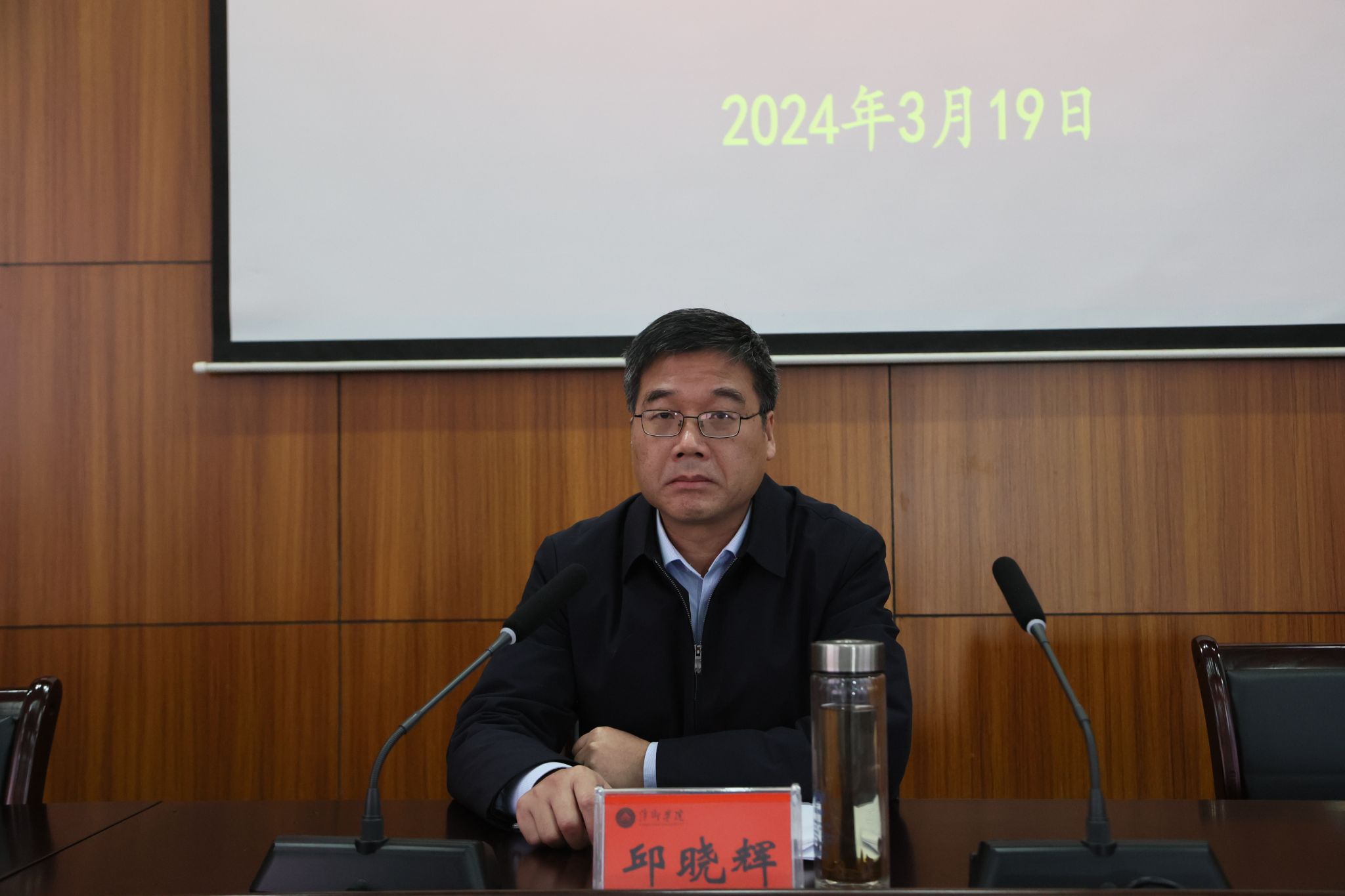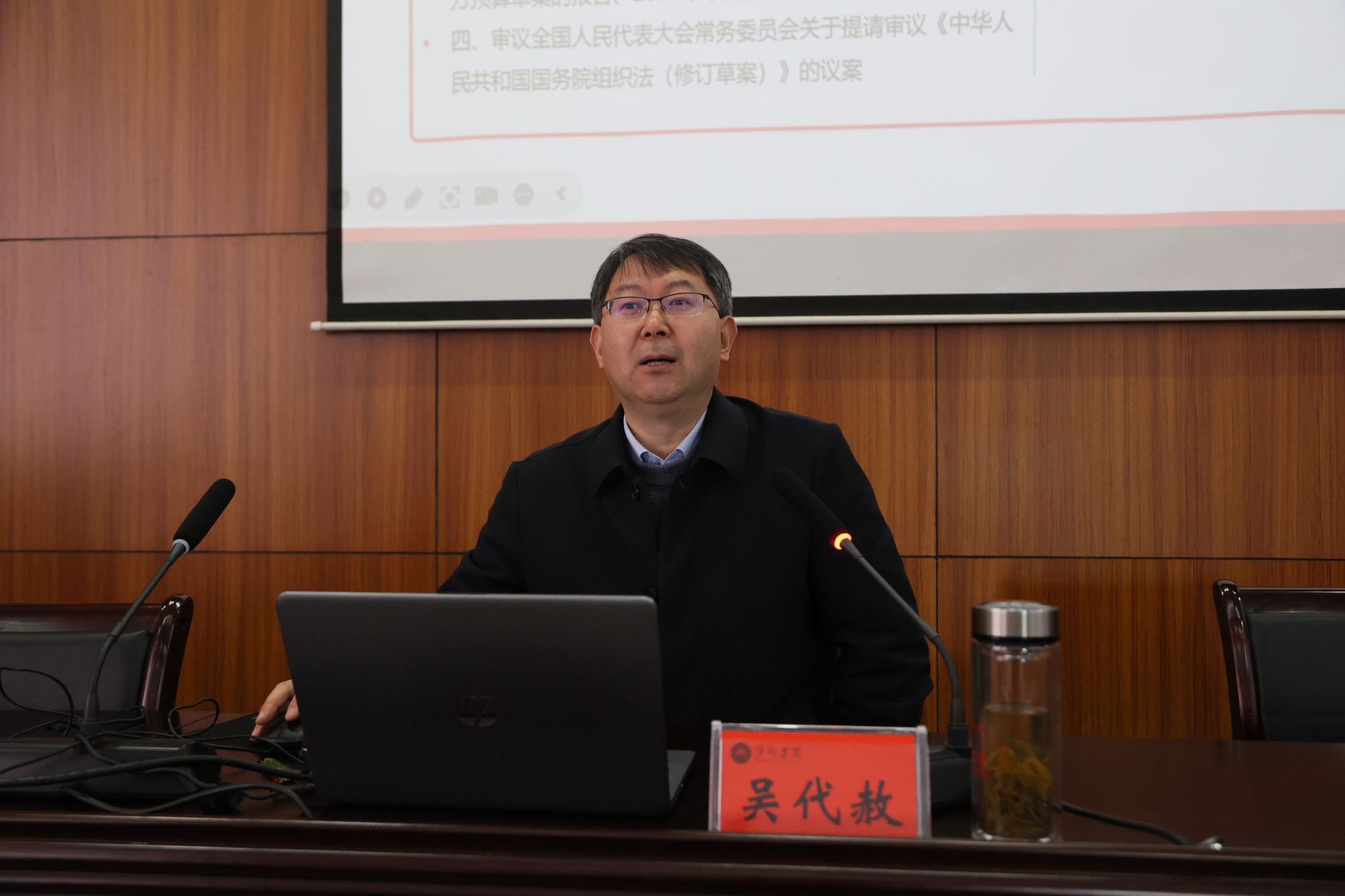 3月19日,全国政协委员、副校长吴代赦在至善楼报告厅专题宣讲2024年全国两会精神。全体在家校领导以及全校副处级以上领导干部聆听报告。报告会由校党委书记邱晓辉主持。