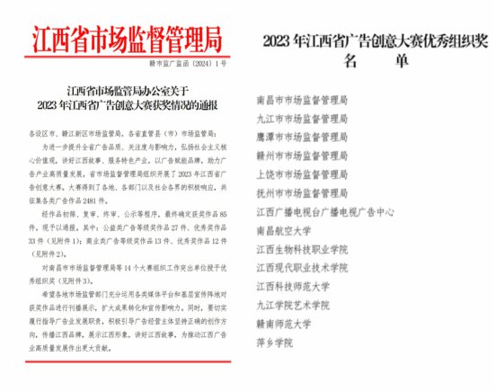 江西省广告创意大赛由江西省市场监督管理局主办,旨在进一步提升江西省广告品质、关注度与影响力,弘扬社会主义核心价值观,讲好江西故事、服务特色产业,以广告赋能品牌,助力广告产业高质量发展。大赛启动以来,校科研处和艺术学院加强与主管部门沟通,精心组织、安排专业老师团队指导学生备战。