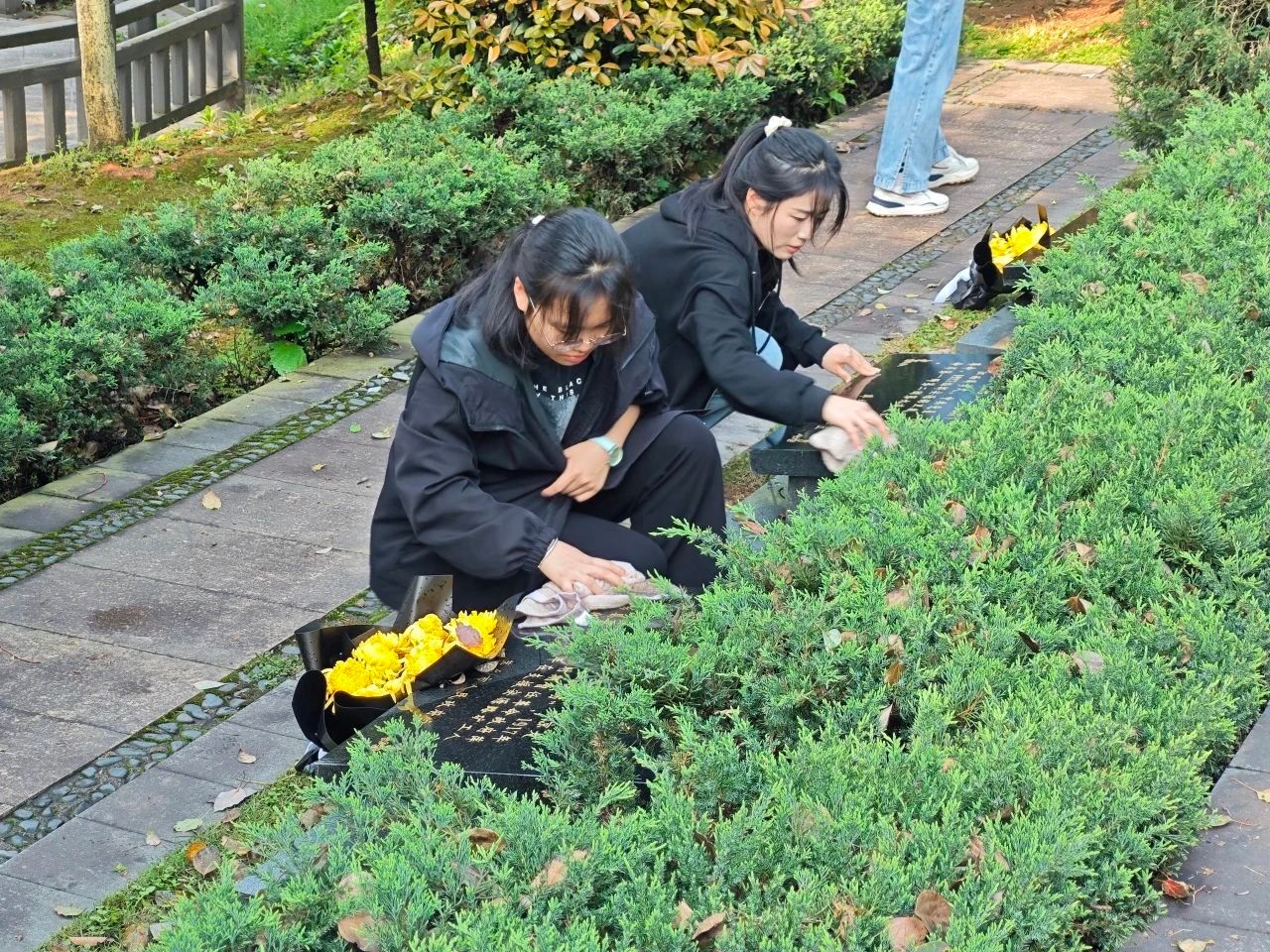 随后,全体成员缓步迈向烈士陵园,为烈士们献上金菊,并在墓前鞠躬默哀。心中想起革命时期的峥嵘岁月,忆起战士们在战场上奋勇杀敌的壮烈场景,书本上的历史仿佛重现在眼前。每一个烈士的墓碑都被擦得锃亮,每一个烈士的名字都熠熠生辉。碑前一朵朵端庄淡雅的金菊,象征着他们崇高的品质和无私的精神,也寄托着我们深深的哀思与怀念,代表着后辈们无限的敬仰。