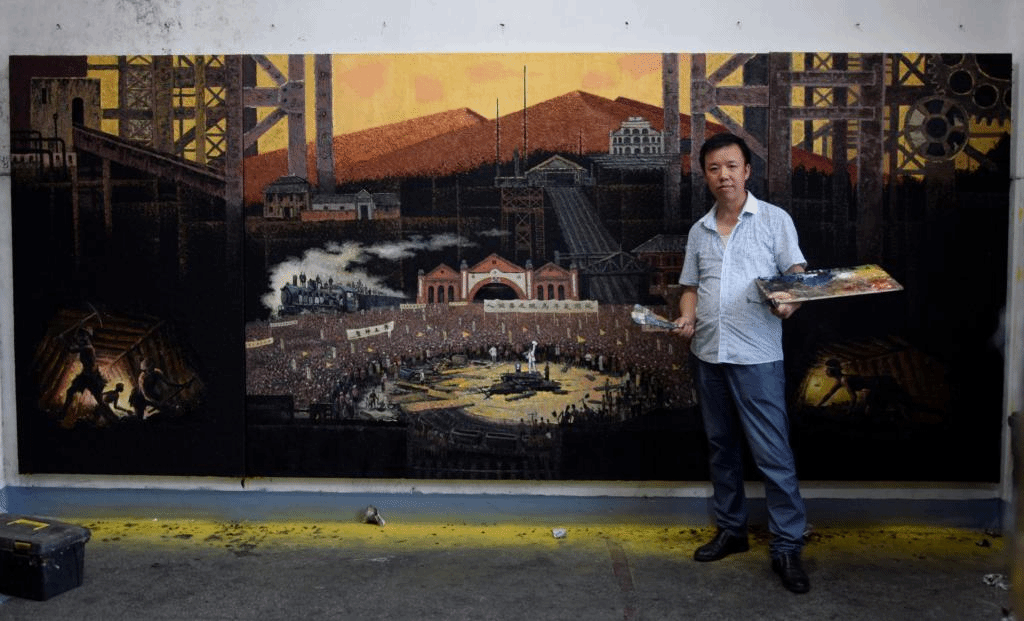 唐柏林说,我画的是《安源路矿工人大罢工》,习近平总书记曾在讲话中提到过安源精神,我从领会安源精神的内涵入手,用画面表达中国工人阶级在近百年来发愤图强,追求民族复兴的伟大创举。安源煤矿是清代末年汉冶萍公司的重要组成部分,汉冶萍公司是中国旧知识分子为了抵抗外敌,穷则思变,探索产业经济的救国途径。而安源路矿工人大罢工,是在中国共产党的领导下,工人阶级开始觉醒,中国革命走向波澜壮阔的正确道路,从而挽救了中华民族的命运,使中国真正走向了伟大的民族复兴之路。