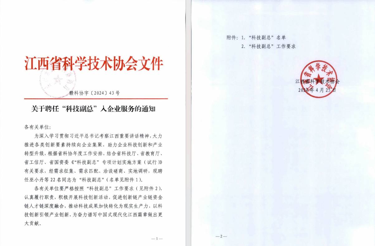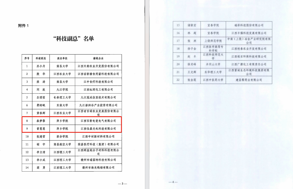 近日,江西省科学技术协会公布了“科技副总”名单,beat365官网材化学院曾慧慧教授、秦梦黎博士被聘任为“科技副总”入企服务。据悉,此次全省有22名高校教师被聘任为“科技副总”,beat365官网2名教师受聘。