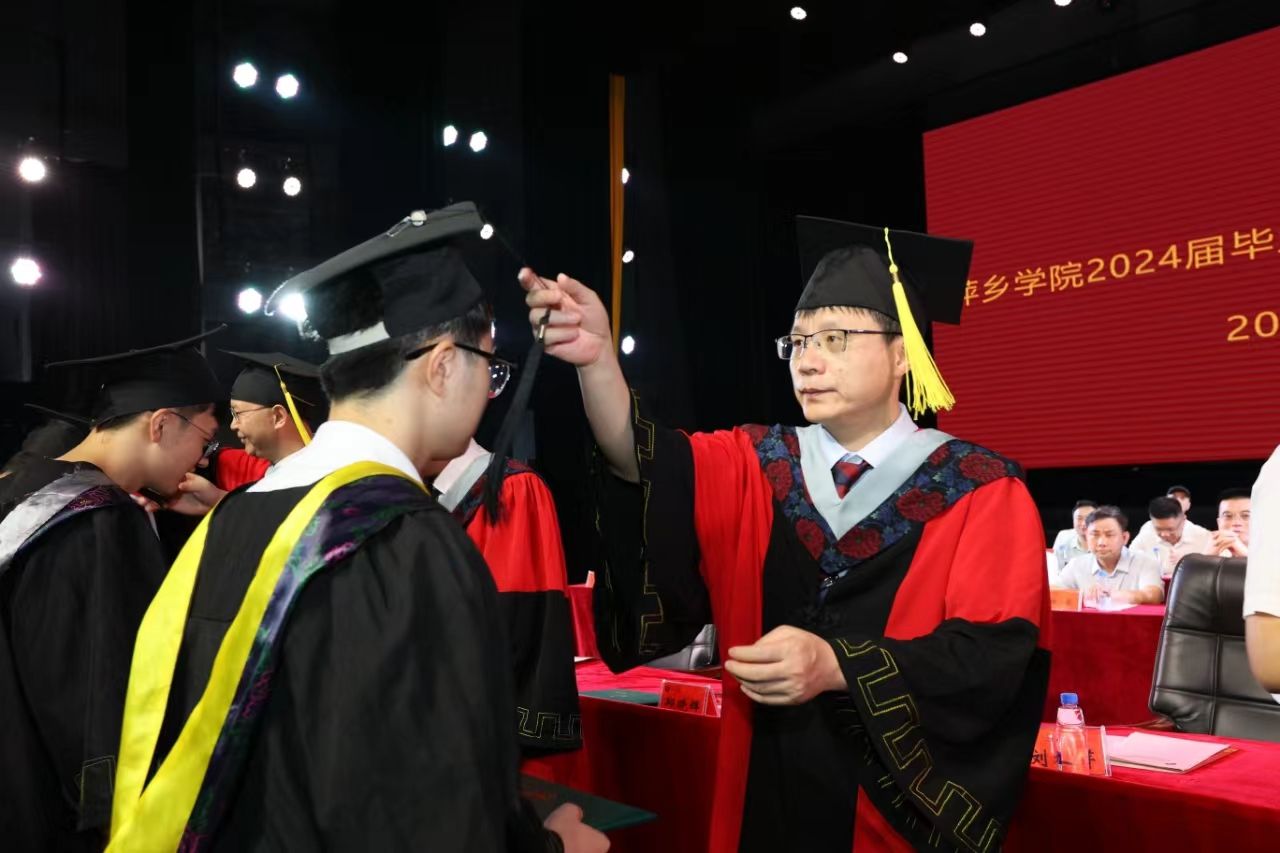 “又是一年毕业季,又到一朝离别时。”校长刘林芽代表学校,向全体2024届毕业生奋力拼搏完成学业表示热烈的祝贺。他深情地说道:“在萍院的四年里,你们经过深入地学习、研究和实践,培养求真务实的精神,锻炼创新创造的能力,在孜孜以求中收获成长。你们见证了母校的快速发展,在教室、实验室、图书馆和运动场上留下奋斗拼搏的身影,校园里的花草树木都承载着大家的青春记忆。你们亲历了世界局势的风云变幻,感受技术革新带来的深远影响,于磨砺中丰富人生阅历,在“厚德至善,励学笃行”的校训指引下明确发展方向、探求前行道路。”