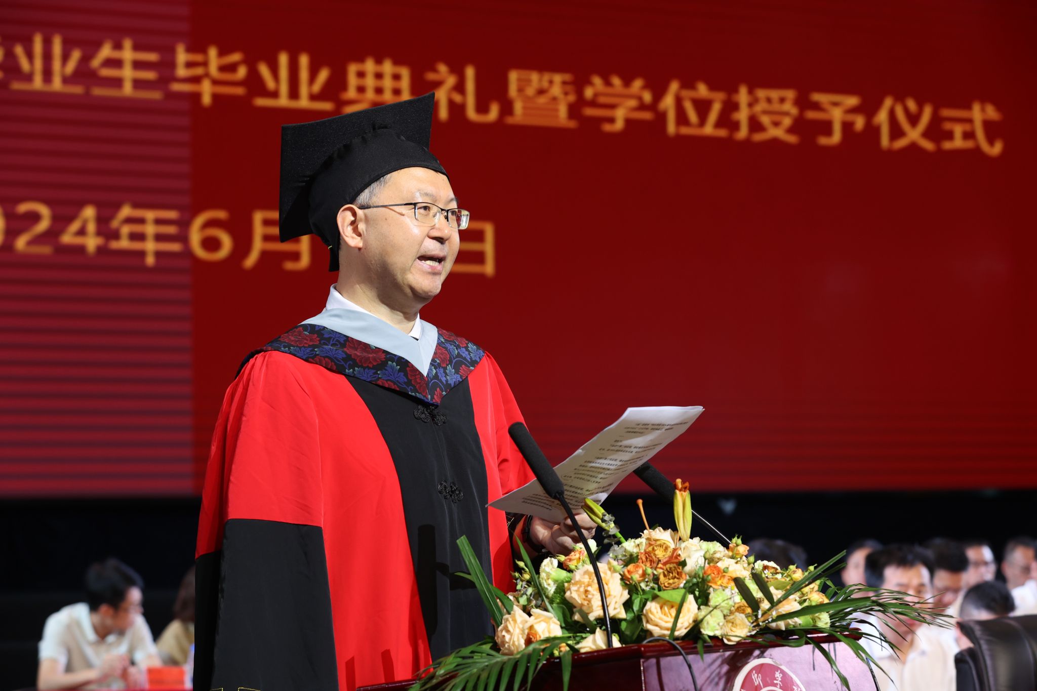 仲夏之时,万物并秀。6月14日上午,beat365官网2024届学生毕业典礼暨学位授予仪式在音乐厅举行。校领导邱晓辉、刘林芽、吴代赦、刘培圣、贺晓梅、王林清出席毕业典礼。各二级学院党委书记、院长、党委副书记、相关部门负责人,校友代表、教师代表、毕业生代表和非毕业生代表现场参加典礼。典礼由副校长吴代赦主持。