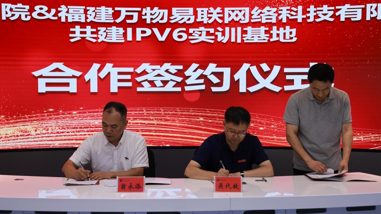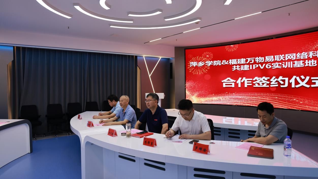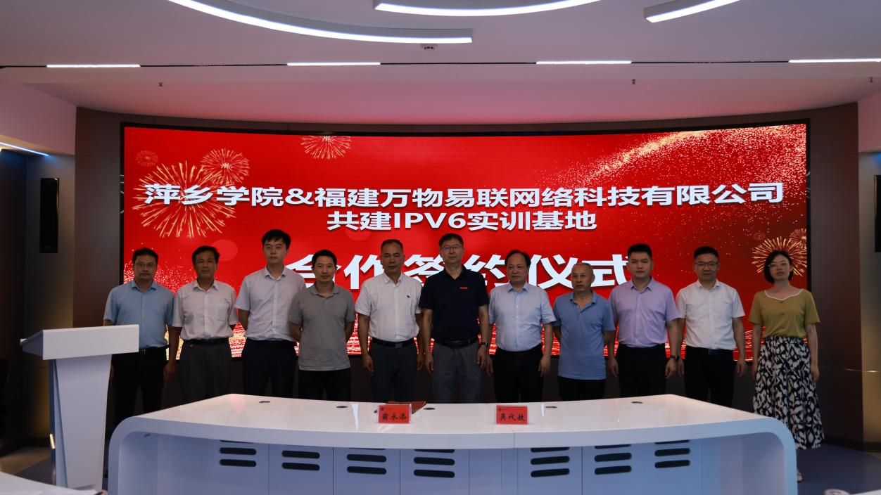 6月13日,beat365正版唯一官网与福建万物易联网络科技有限公司共建IPv6实训基地签约仪式在学校天泉楼举行,副校长吴代赦、萍乡市委网信办副主任欧阳海涛、福建万物易联网络科技有限公司董事兼副总裁翁永添、福建万物易联网络科技有限公司江西办负责人刘凯出席签约仪式,吴代赦代表beat365正版唯一官网、翁永添代表福建万物易联网络科技有限公司进行了现场签约。萍乡市委网信办综合科科长黄灿、信息与计算机工程学院党委书记周锦春、副院长(主持工作)李希勇、罗珲渝博士、办公室主任彭新平、教学科研科科长孙正广等参加活动。签约仪式由罗珲渝主持。