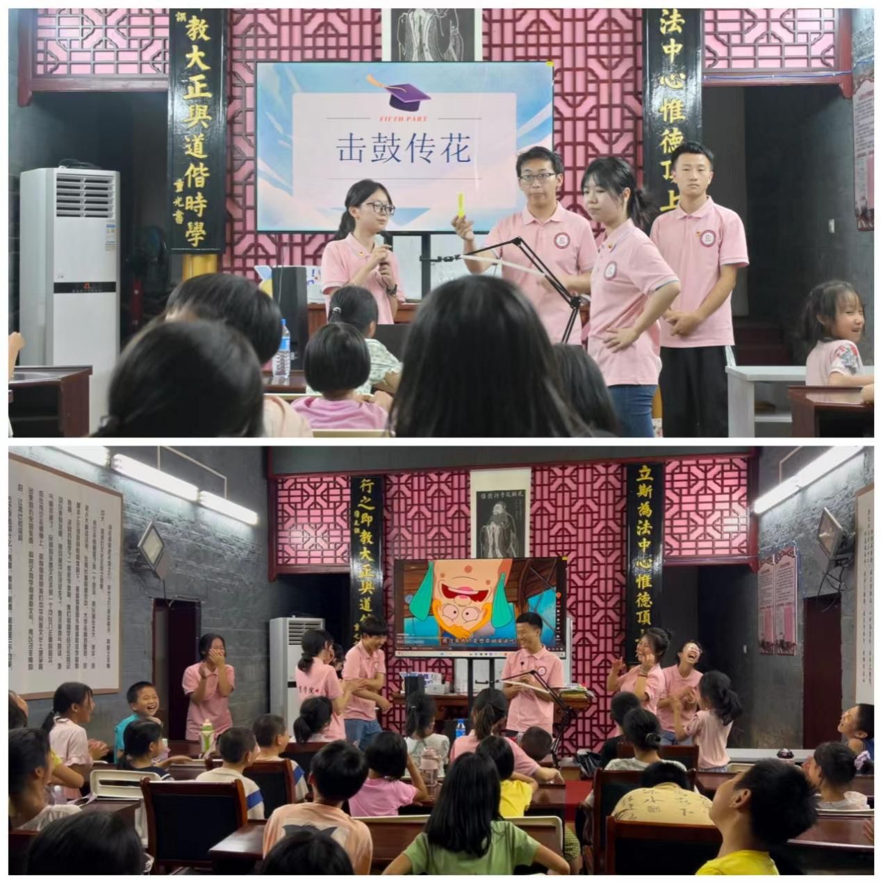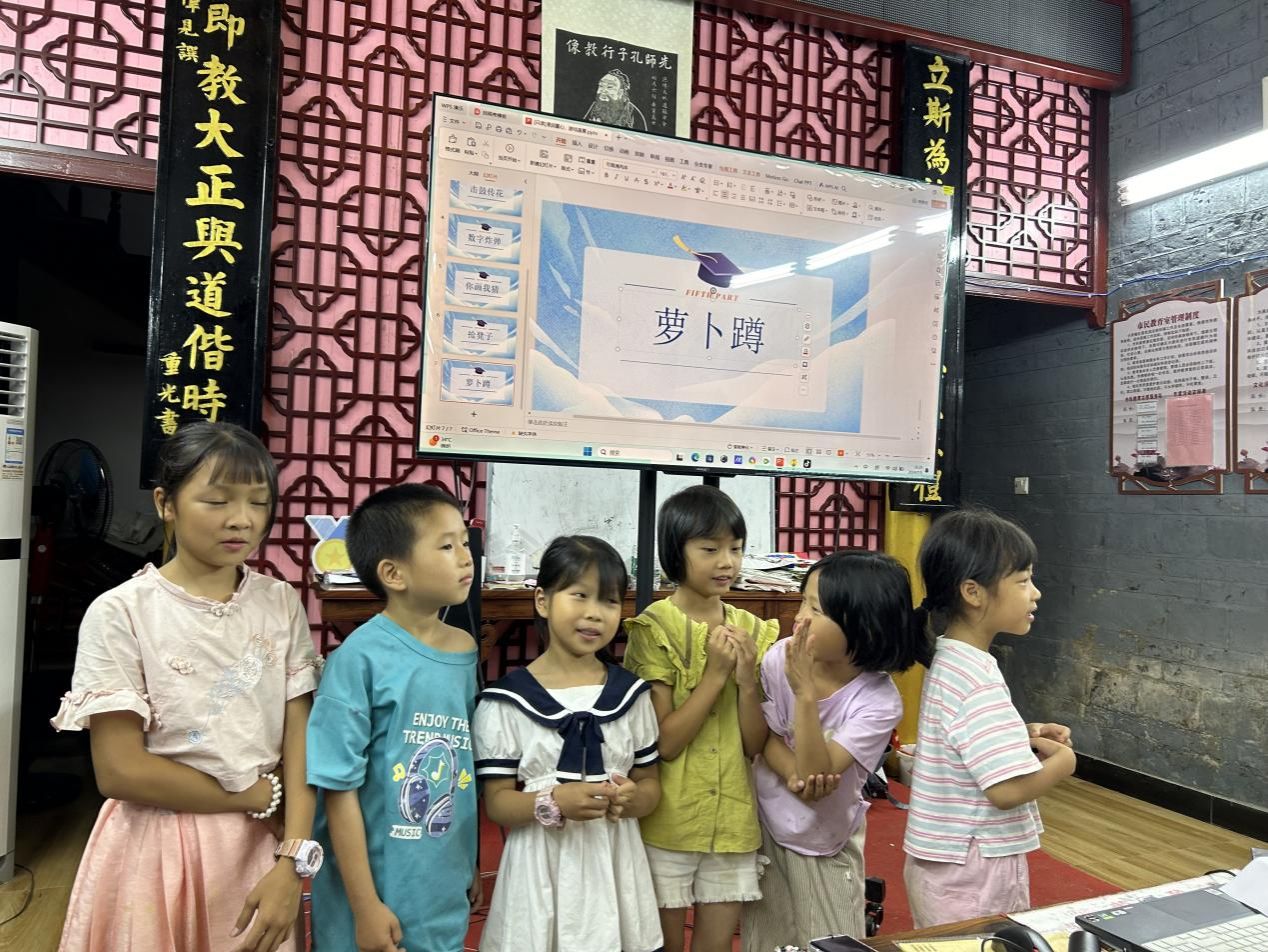 音韵萦绕,击鼓传花。孩子们跟随音乐的节奏将手中的“花”按照既定路线进行传递,音乐进入高潮时,歌声戛然而止——手中捧着“花”的孩子进行才艺表演,有的人将古诗倒背如流,有的人歌声婉转动听。之后,志愿者老师们一同加入,对视频进行配音表演,国学馆中充斥着一片欢声笑语。