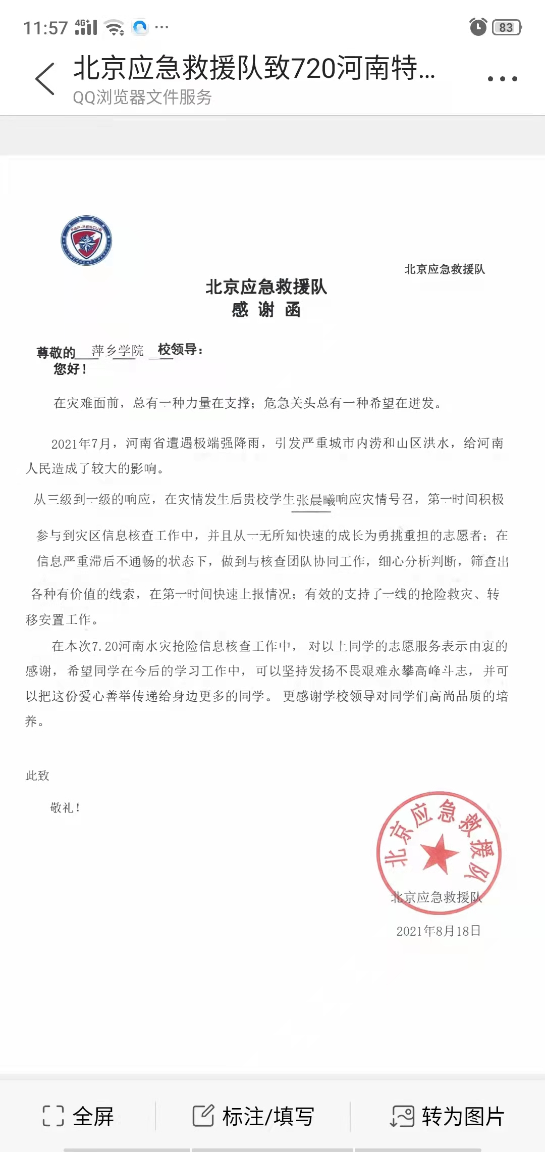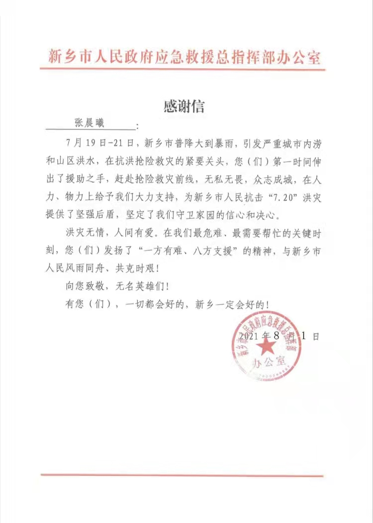 今年暑期,河南遭遇特大暴雨灾害和出现疫情反弹,beat365官网工程与管理学院19级学生张晨曦同学积极投身抗洪救灾和疫情防控中表现突出,受到新乡市人民政府应急救援总指挥部办公室、杞县柿园乡人民政府、北京应急救援队的表扬与肯定。