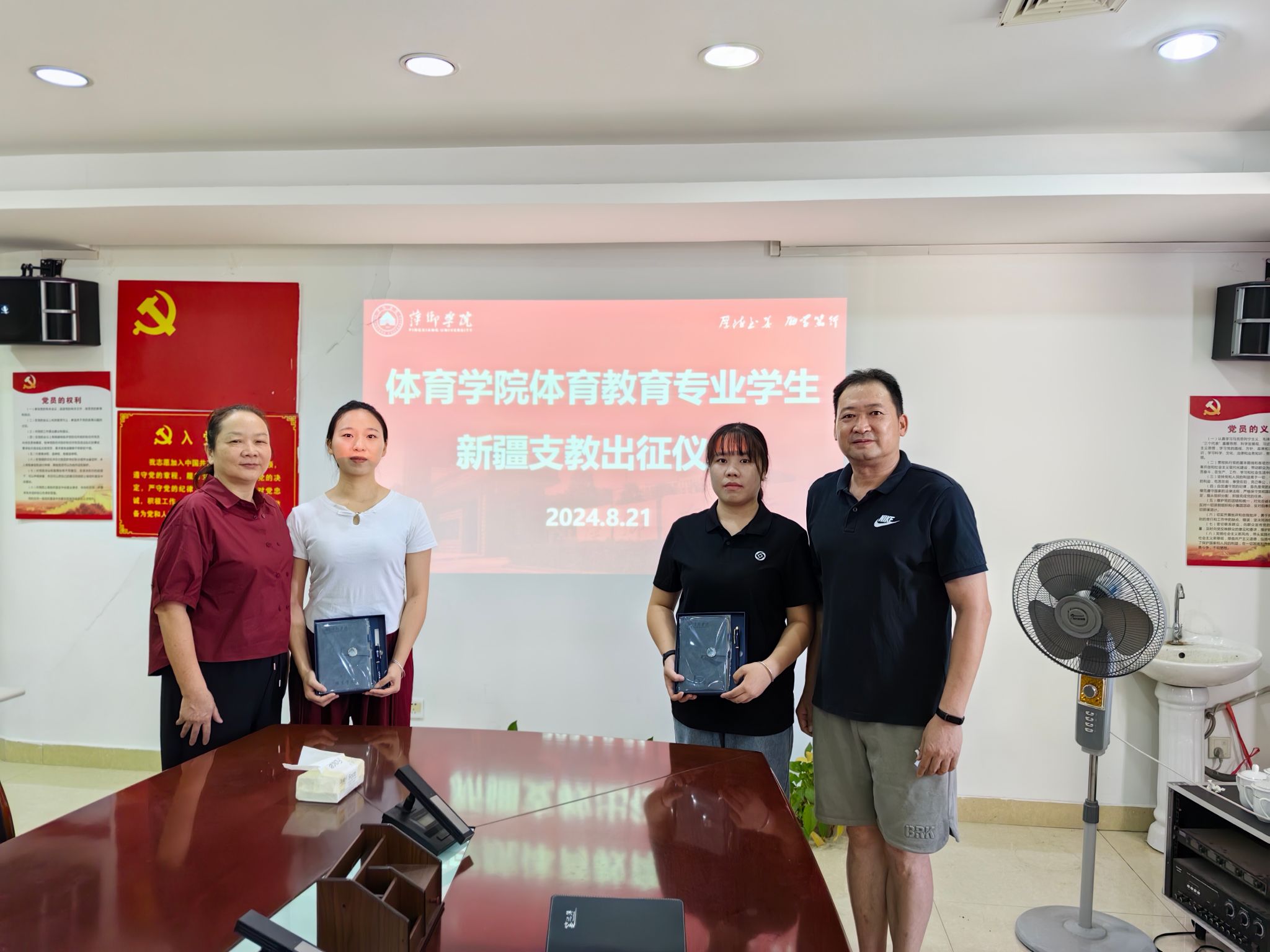 为响应国家号召,贡献教育力量,体育学院冷紫妮、李怡娟同学积极投身援疆支教工作。8月21日,体育学院专门为援疆支教的学生举行了简短而又充满温情的出征仪式,体育学院党政班子成员参会。