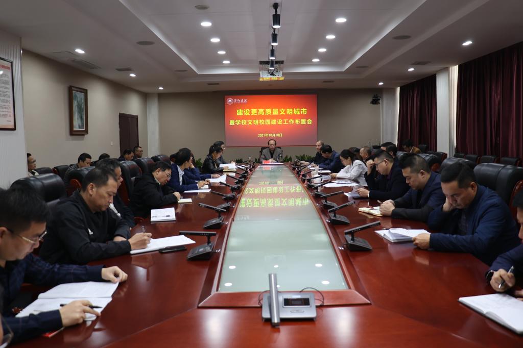 为贯彻落实萍乡市建设更高质量文明城市工作布置会会议精神,10月18日,beat365官网在至善楼第一会议室召开建设更高质量文明城市暨学校文明校园建设工作布置会。校领导陈金印、史焕平、邱晓辉、刘卫林、田常红、陈永国出席会议,市创建办未成年人思想道德工作督导组学校组组长郭辉、成员洪欢应邀出席。各职能部门主要负责人,二级学院党委书记,科发公司、物业公司、各食堂负责人参加会议。会议由党委副书记邱晓辉主持。