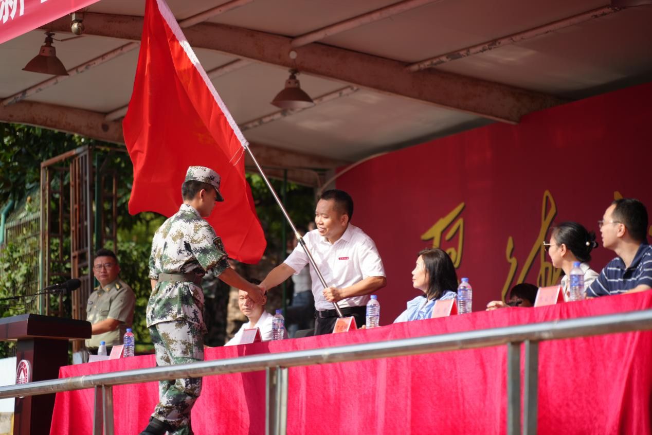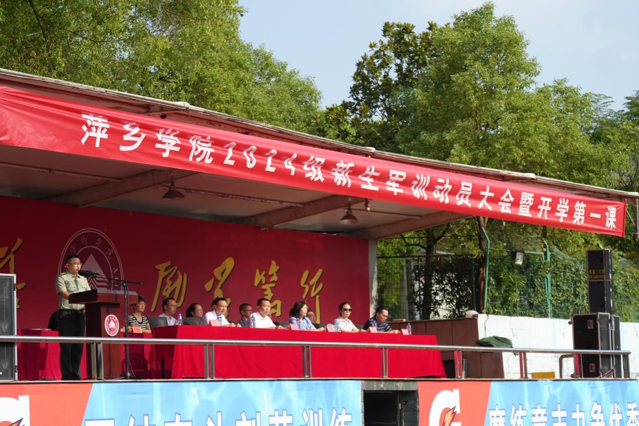 刘培圣作军训动员讲话。他代表学校向参训的新同学们表示热烈的欢迎和亲切的问候,向关心支持本次军训活动的部队官兵和学校各有关部门表示衷心的感谢。他表示,我们要深入学习贯彻习近平总书记在接见参加第33届奥运会的中国体育代表团重要讲话精神,要通过努力上好军训这门大学开学第一课,真正实现在训练中磨炼斗志,在进步中获得成长,从而为大学四年的学习生涯开好局、起好步。同时,他代表学校向同学们提几点希望和要求:一是振奋精神,认真参训。所有同学都应集中精力参加军训,认真听讲解,仔细看示范,牢记要领,刻苦训练,力争取得好的成绩,以实际行动交出一份满意的答卷。二是严于律己,服从指挥。希望全体同学借助军训课程的雕琢打磨,用更加坚强和成熟的体魄心智,勇敢地迎接新挑战,展现新风貌,为今后在萍院的学习和生活打下坚实的基础。三是攻坚克难,奋勇争先。希望大家要做好充分的思想准备,以良好的精神状态勇敢面对和战胜军训过程中遇到的挑战和困难,在军训这个竞技场和赛马场上奋勇展现青春作为、彰显青春风采。四是科学施训,确保安全。眼下正值秋老虎发威的高温燥热时节,既要按纲施训,又要科学施训,灵活施训,安全施训,须坚决避免和防止各类矛盾纠纷和意外事态发生,全力确保本次军训安全圆满结束。