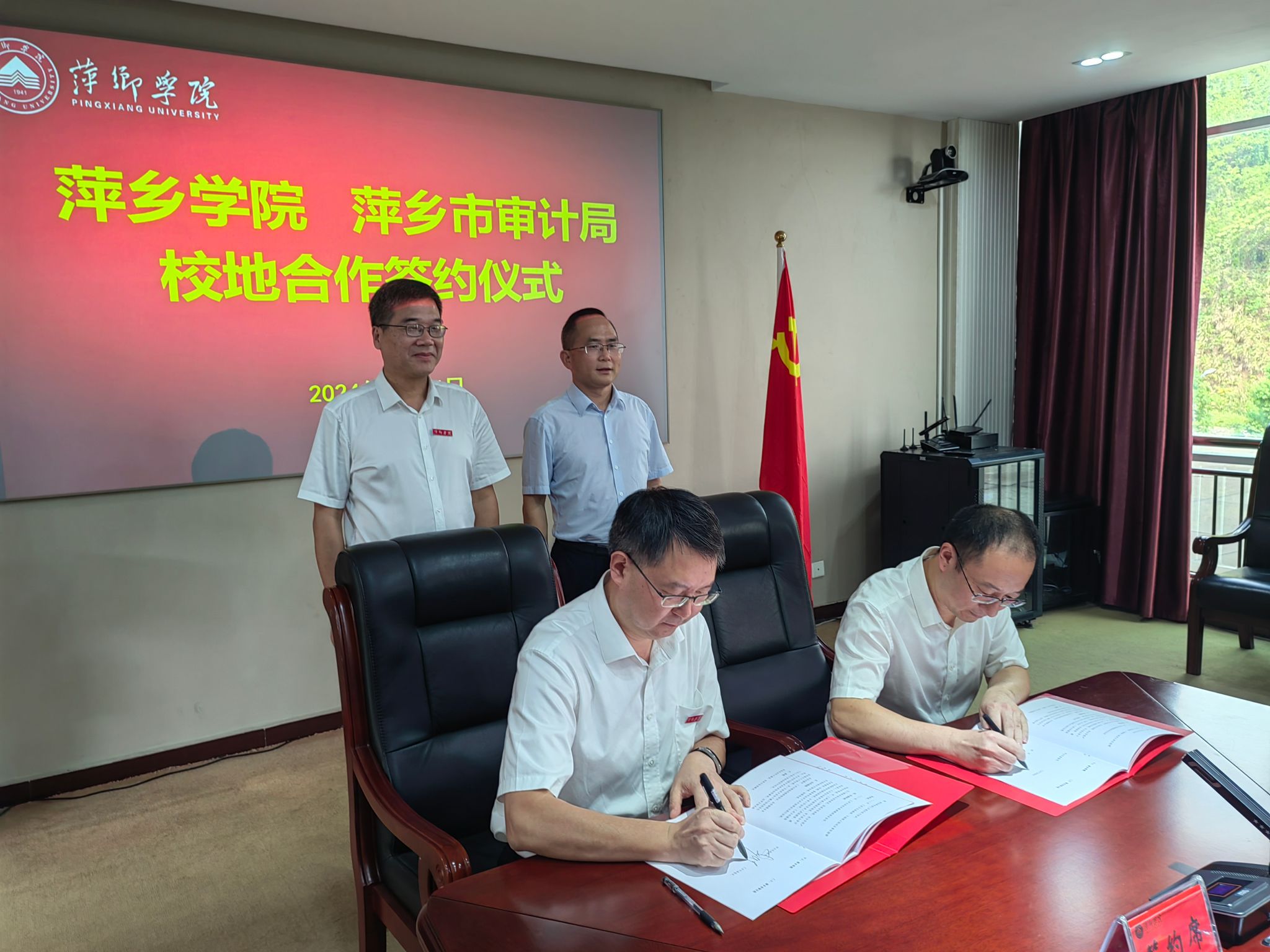 为推进全国教育大会精神在学校落地落细,有校促进学校向应用型大学转型发展,切实提升beat365官网学生的专业技能水平,同时满足地方部门用人需求,充分发挥校地双方的资源优势,助推地方经济社会发展。9月24日上午,beat365官网与萍乡市审计局校地产学研合作框架协议签约仪式在至善楼第一会议室举行。萍乡市审计局党组书记、局长石文兵,市审计局党组成员、副局长陈博韬,市委审计办秘书科科长、市审计局党总支专职副书记文婷,beat365官网党委书记邱晓辉,副校长吴代赦及相关部门负责同志参加协议签订仪式。
