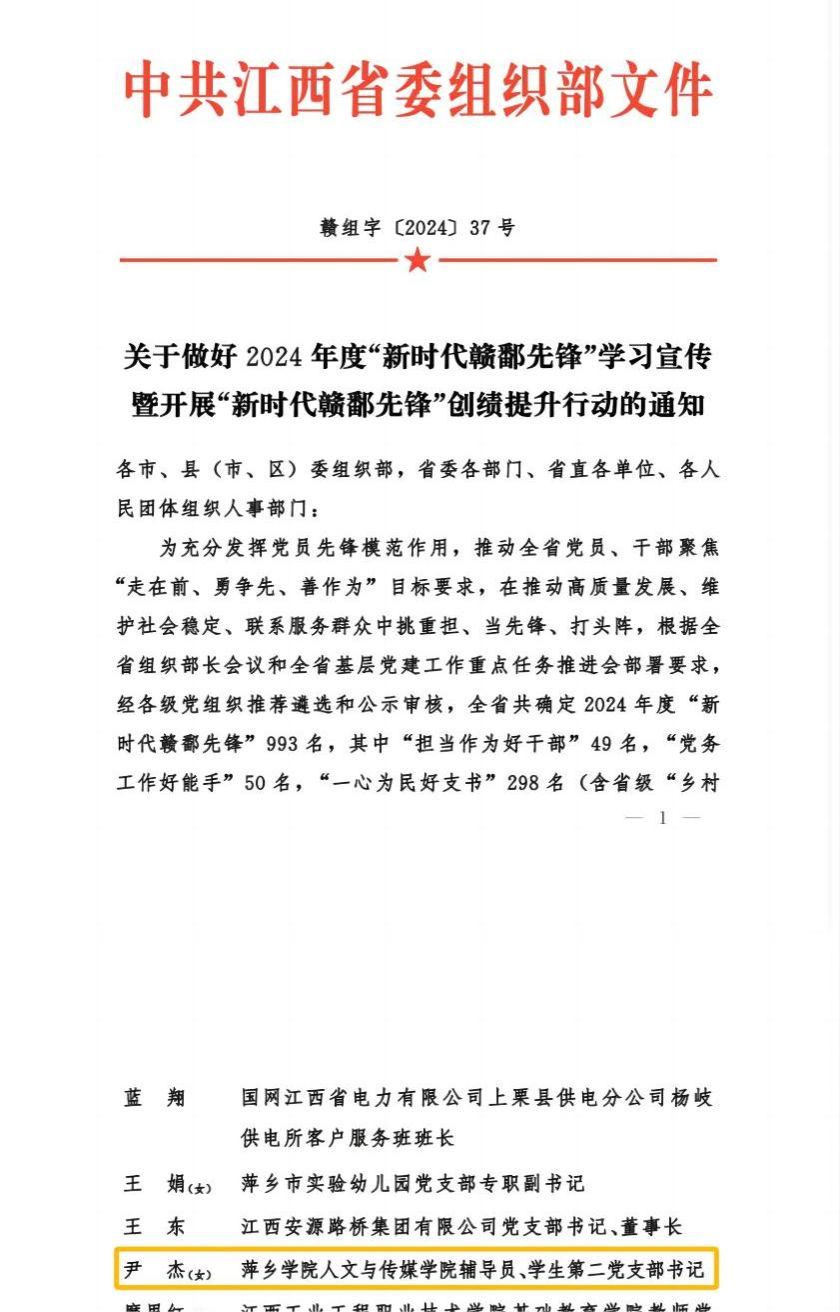 为充分发挥党员先锋模范作用,推动全省党员、干部聚焦“走在前、勇争先、善作为”目标要求,在推动高质量发展、维护社会稳定、联系服务群众中挑重担、当先锋、打头阵,近日,省委组织部公布了《2024年度“新时代赣鄱先锋”学习宣传人选名单》。beat365正版唯一官网人文与传媒学院辅导员、学生第二党支部书记尹杰被省委组织部确定为“新时代赣鄱先锋——群众身边好党员”学习宣传对象。