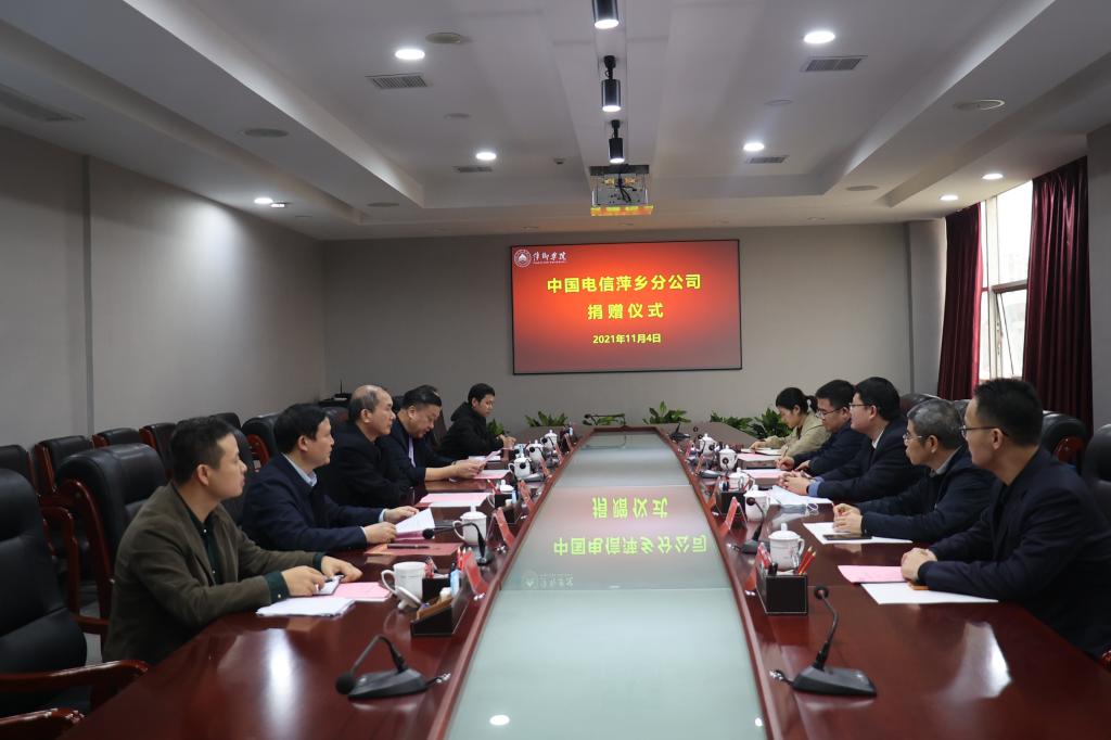 11月4日,中国电信萍乡分公司捐赠仪式在beat365官网第二会议室举行。中国电信集团有限公司萍乡分公司总经理刘挺、副总经理姚萍,校党委副书记、校长史焕平,党委委员、副校长郭伟,党委委员、宣传部部长陈永国出席捐赠仪式。中国电信集团有限公司萍乡分公司相关部门负责人以及学校相关部门负责人参加捐赠仪式。捐赠仪式由陈永国主持。