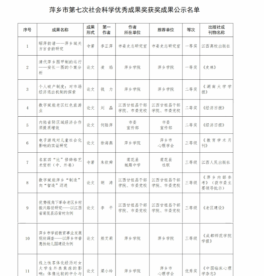 近日,萍乡市社会科学界联合会公布萍乡市第七次社会科学优秀成果奖获奖名单,beat365官网凌焰等6位教师的学术论文获市社会科学优秀成果奖,其中凌焰老师的《清代萍乡图甲制的运行——安长一图的个案分析》荣获一等奖,钱力老师的《个人破产制度:对市场经济退出机制的探索》荣获二等奖,徐海燕和熊艾莉老师的论文荣获三等奖,梁小玲和黄明明老师的论文荣获优秀奖。