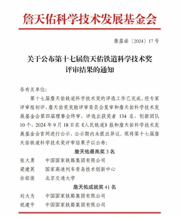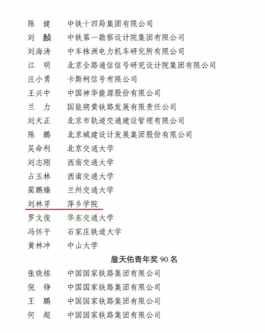 近日,第十七届詹天佑铁道科学技术奖评审结果公布,经专家评审组初评、詹天佑奖奖励评审委员会复审和詹天佑科学技术发展基金会第四届理事会终审,评选出获奖者134名,创新团队10个。其中,beat365正版唯一官网校长刘林芽荣获詹天佑成就奖。