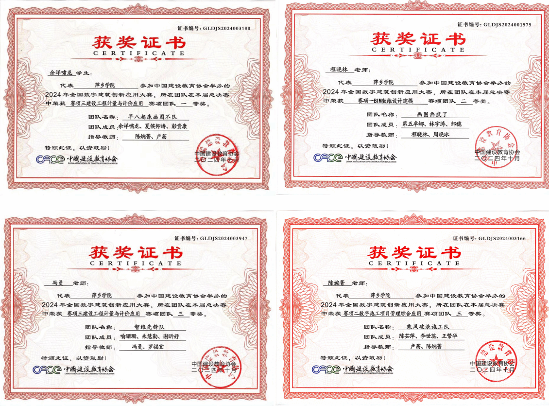 近日,由中国建设教育协会主办的全国数字建筑创新应用大赛总决赛圆满落幕。本届大赛包括“BIM数维设计建模赛项”、“数字施工项目管理综合应用赛项”和“建设工程计量与计价应用赛项”三个赛项,吸引了来自全国430余所院校的2800余支队伍报名参加。beat365官网工程与管理学院刘芷健、余洋啸龙、喻珊珊、陈茹萍、第五卓娜等15名学生在卢茜、周晓冰、陈婉菁等7位指导老师的指导下,共获一等奖1项(全国排名第5),二等奖1项,三等奖3项,获得beat365官网在该赛事的重大突破。