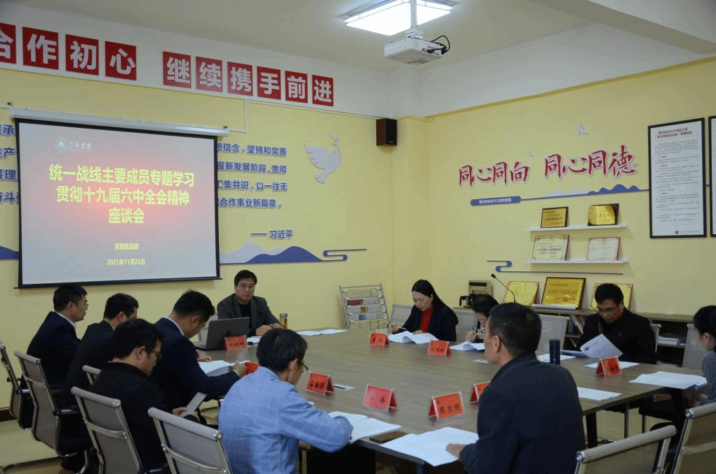 为深入学习贯彻中国共产党第十九届六中全会精神,准确把握全会的精神实质和重大部署,11月25日下午,学校在党外知识分子之家召开统一战线深入学习贯彻中国共产党第十九届六中全会精神座谈会。校党委副书记邱晓辉、党委统战部部长王林清出席座谈会,市政协委员、校各民主党派和统战团体主要成员参加学习并畅谈学习体会。会议由王林清主持。