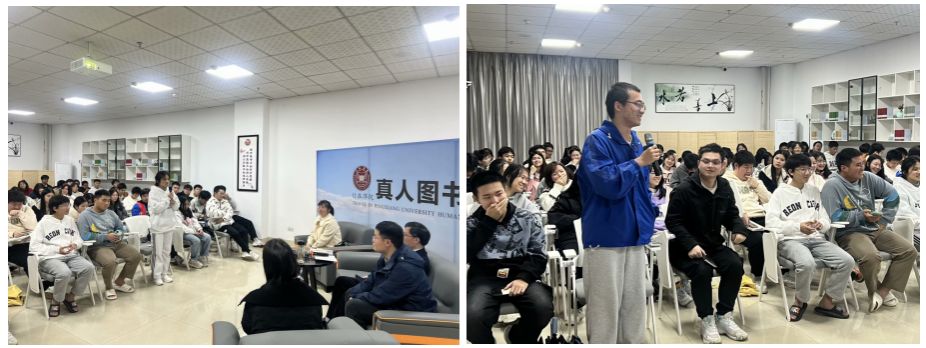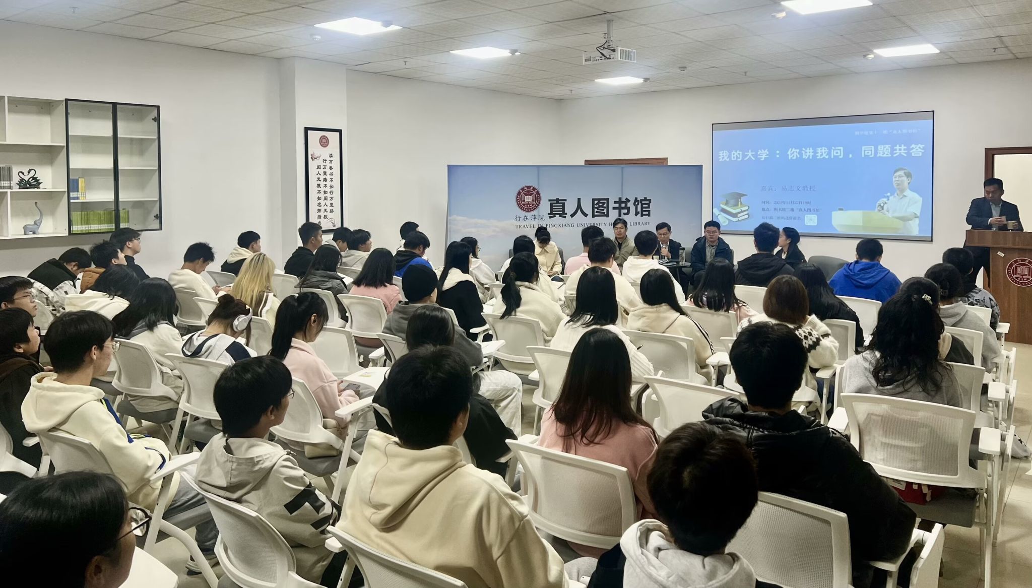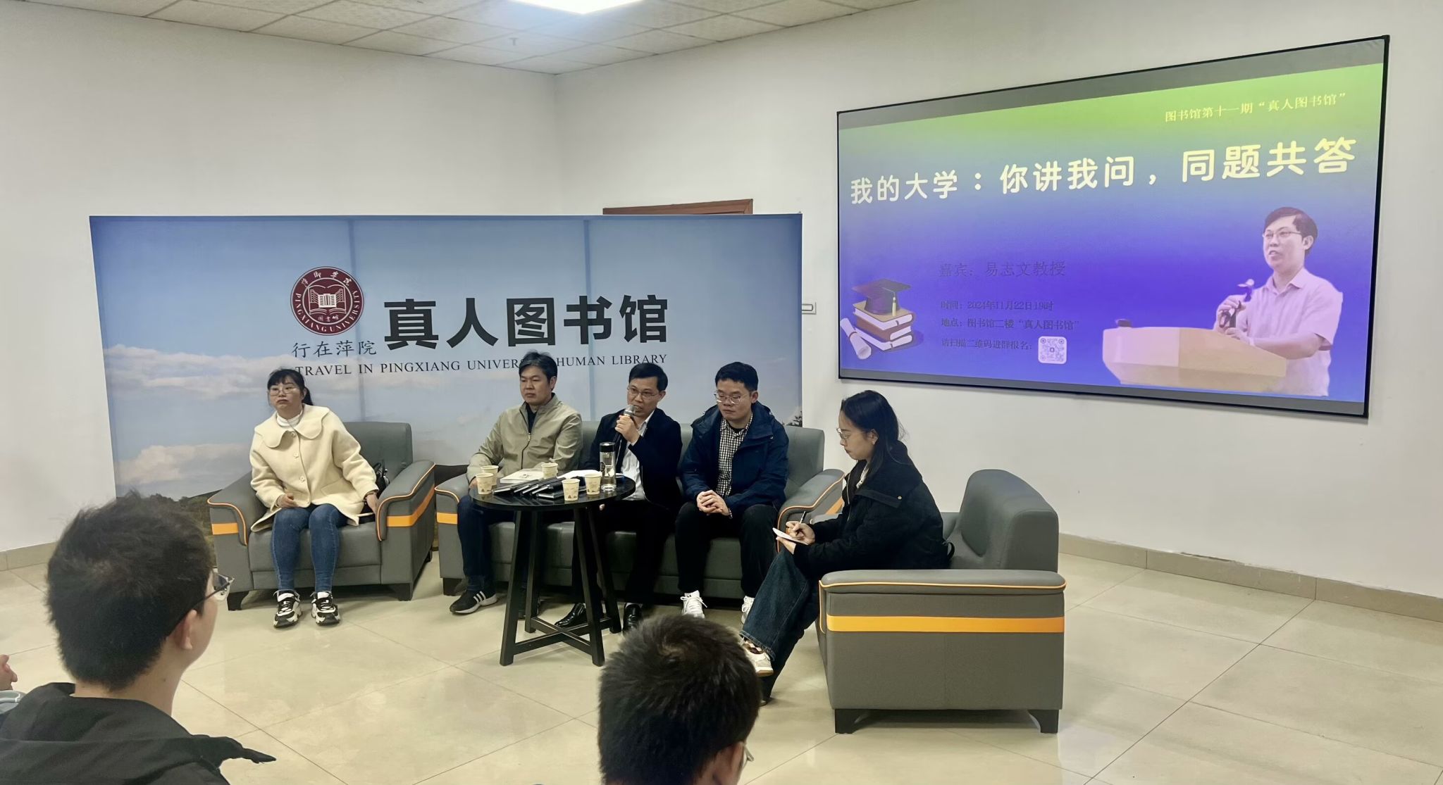 11月22日晚,校图书馆二楼“真人图书馆”,一场题为《我的大学:你讲我问,同题共答》的活动在这里举行。