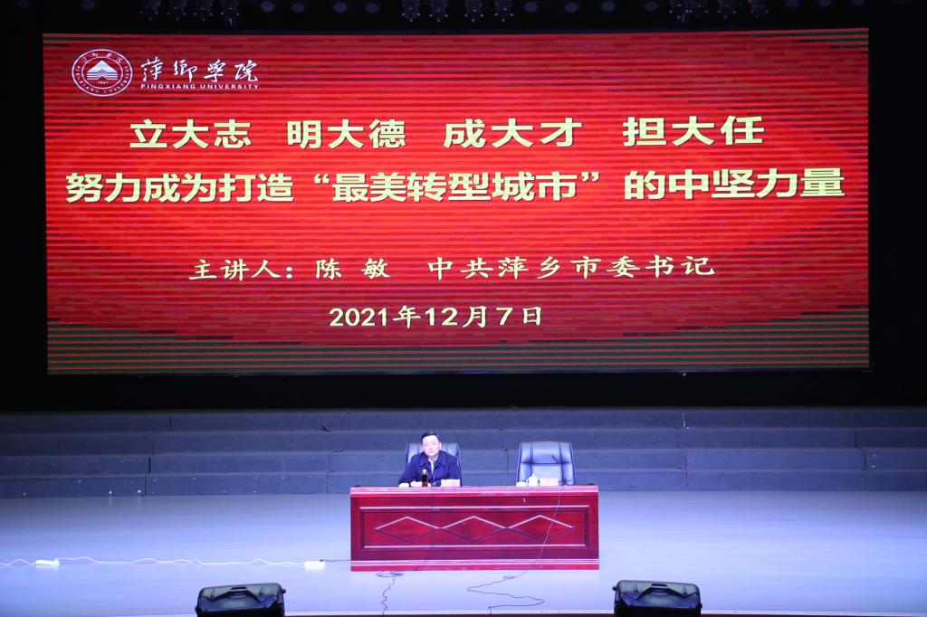 陈敏以“立大志、明大德、成大才、担大任,努力成为打造‘最美转型城市’的中坚力量”为题,把宣讲党的十九届六中全会精神和省、市党代会精神与讲授思想政治理论课相结合,为师生们系统宣讲、深入阐释党百年奋斗重大成就和历史经验的重大意义,党百年奋斗的初心使命和重大成就,中国特色社会主义新时代的历史性成就和历史性变革,“两个确立”的决定性意义,以史为鉴、开创未来的重要要求和从党的百年奋斗历程中汲取智慧和力量;并从“深刻理解和准确把握过去五年奋斗历程的经验启示”“深刻理解和准确把握省情、市情特征的重要判断”“深刻理解和准确把握全省、全市工作的总体要求”“深刻理解和准确把握今后五年的奋斗目标和工作原则”“深刻理解和准确把握今后工作的重点任务”五个方面,全面解读省第十五次党代会、市第十三次党代会作出的重大决策、战略部署。
