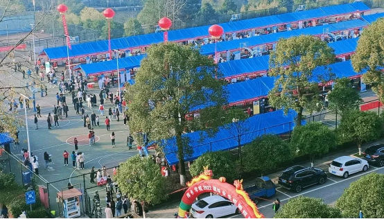 招聘会现场,火红的灯笼迎风飘扬,横幅标语随处可见。蓝色大棚矗立其间,大棚内桌椅摆放整齐,招聘单位按序设点,一切准备就绪。值得注意的是,现场还设置了企业签到点、毕业生签到点、政策咨询处、服务区等协助招聘会顺利开展,电子屏反复播放招聘单位宣传片。
