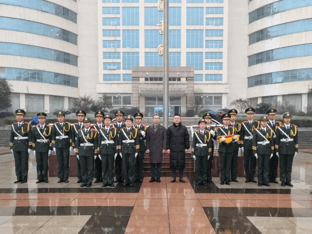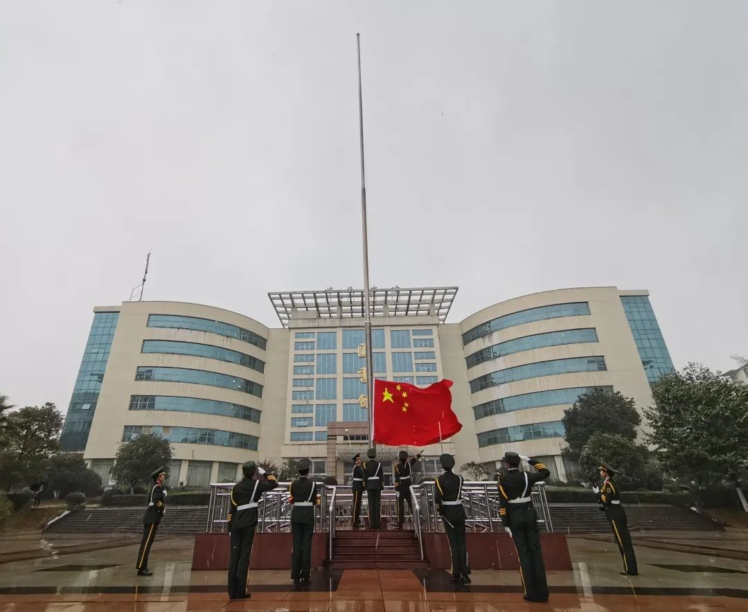 向毛泽东铜像敬献花篮结束后,国旗班交接仪式开始。学校第八届国旗班班长屈武剑郑重地将国旗交接至第九届国旗班班长罗佩君手中。在新一届国旗班班长的带领下,国旗班队员迈着铿锵有力的步伐,护卫着国旗走向升旗台。国歌奏响,全体师生齐唱国歌、行注目礼,鲜艳的五星红旗在风雪中冉冉升起,迎风飘扬。