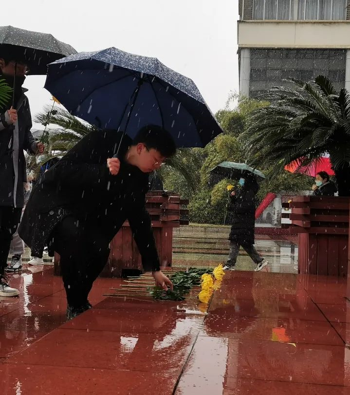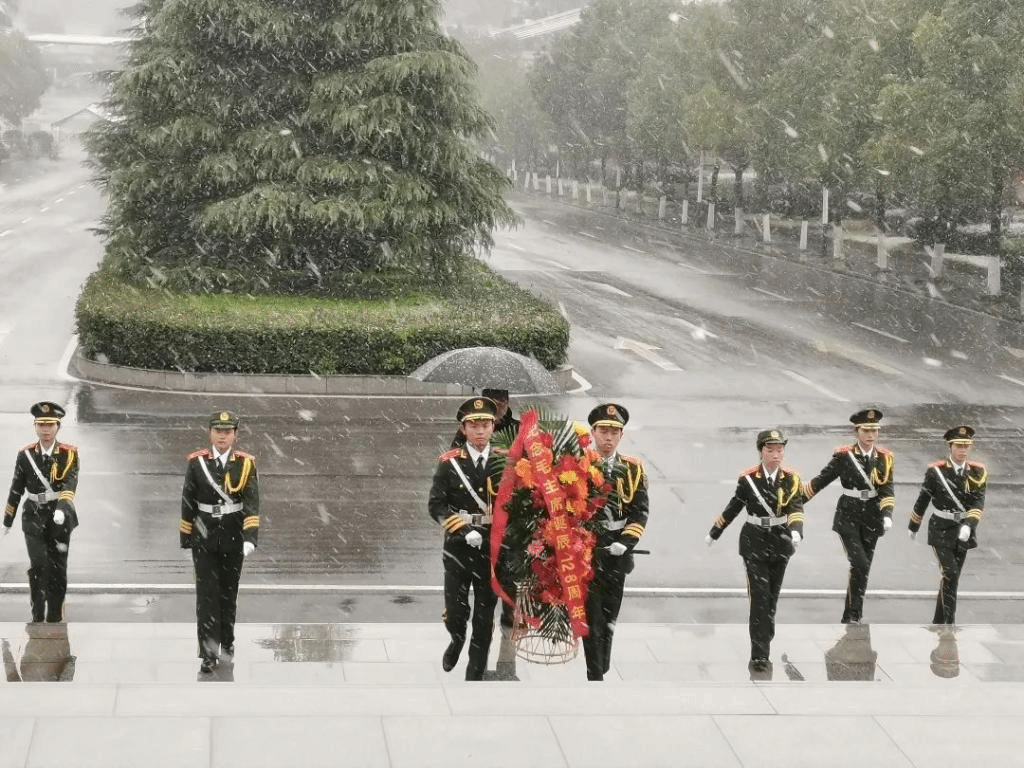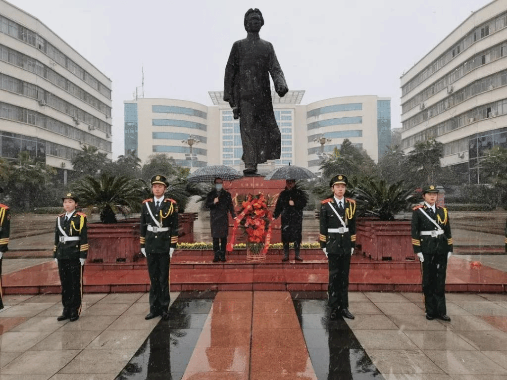 仪式开始,安源红色文化育人广场庄重又安静,漫天雪花缓缓飘落。在全体人员的注视下,挺拔的仪仗队迈着坚毅稳定的步伐护送着花篮走向毛泽东铜像。校团委书记江惺俊上前仔细整理花篮上的红色缎带,各学院学生代表依次向毛泽东同志铜像环绕一圈并献花。全体人员向毛泽东铜像三鞠躬,向伟人表达深切缅怀之情。