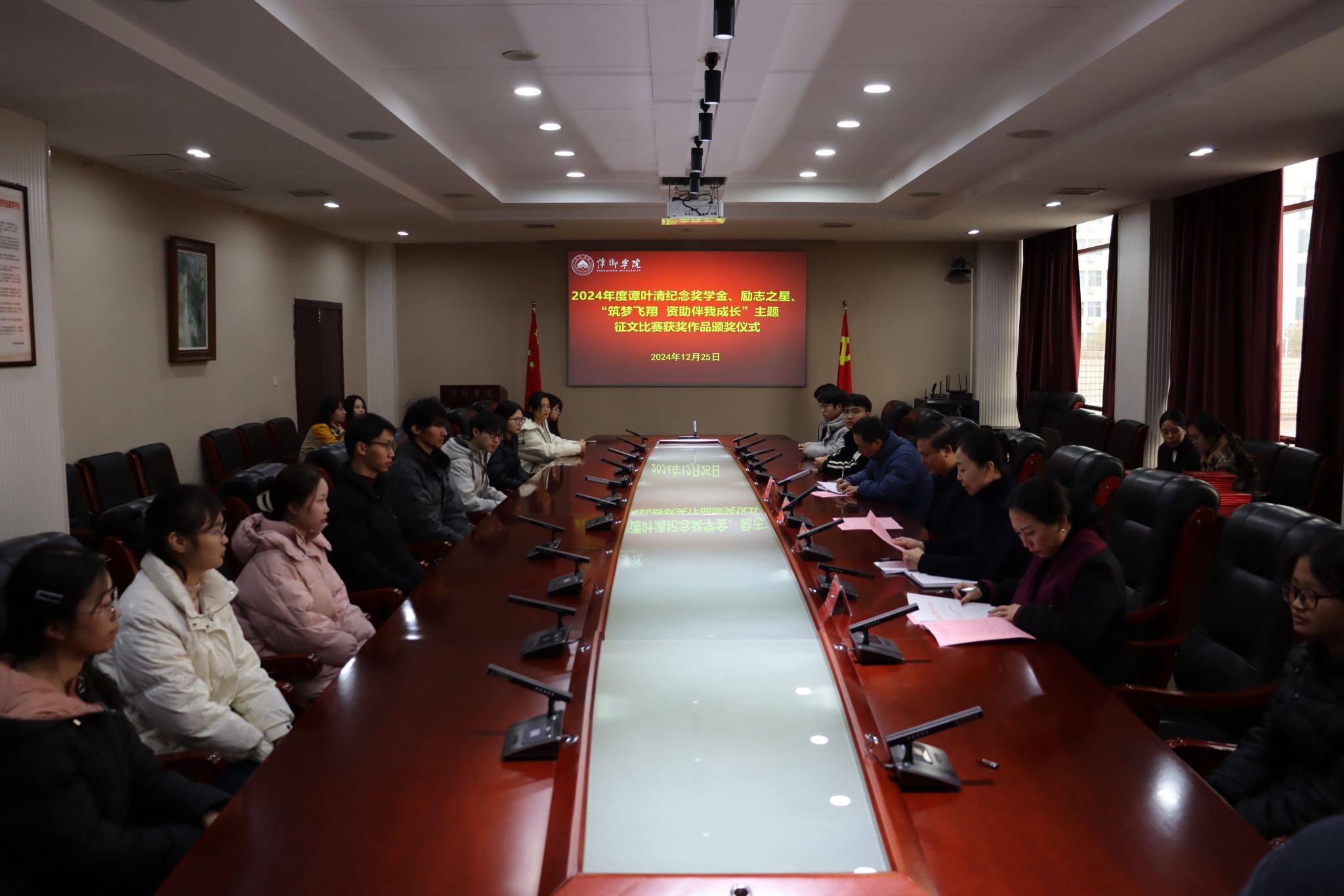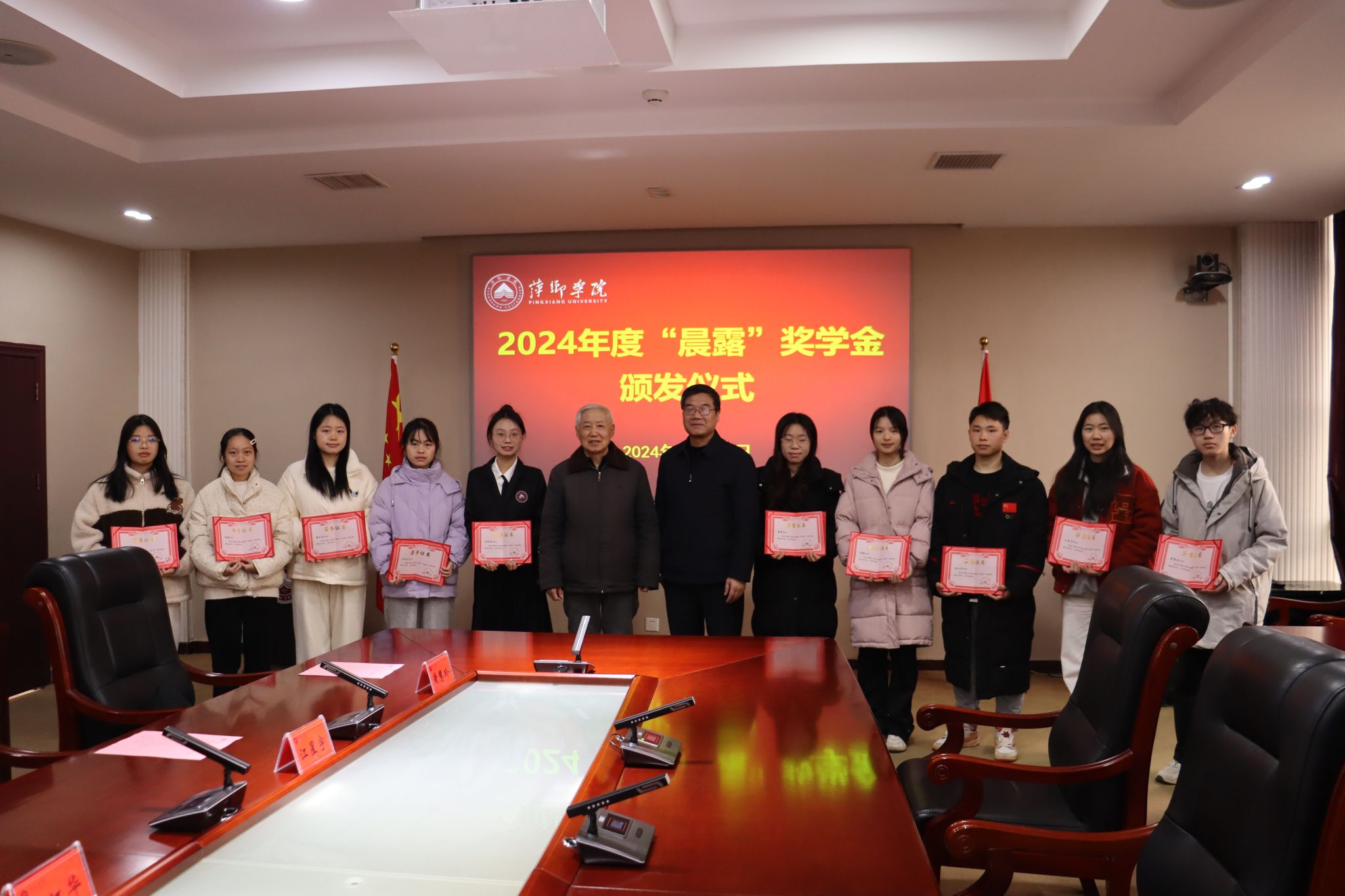 12月25日,beat365官网在至善楼第一会议室举行了2024年度“晨露”奖学金颁发仪式。原萍乡市人大主任尹兆书,校党委书记邱晓辉,校党委委员、副校长陈永国出席仪式。学工处正副处长、资助管理中心相关工作人员以及获奖学生参加仪式,仪式由陈永国主持。
